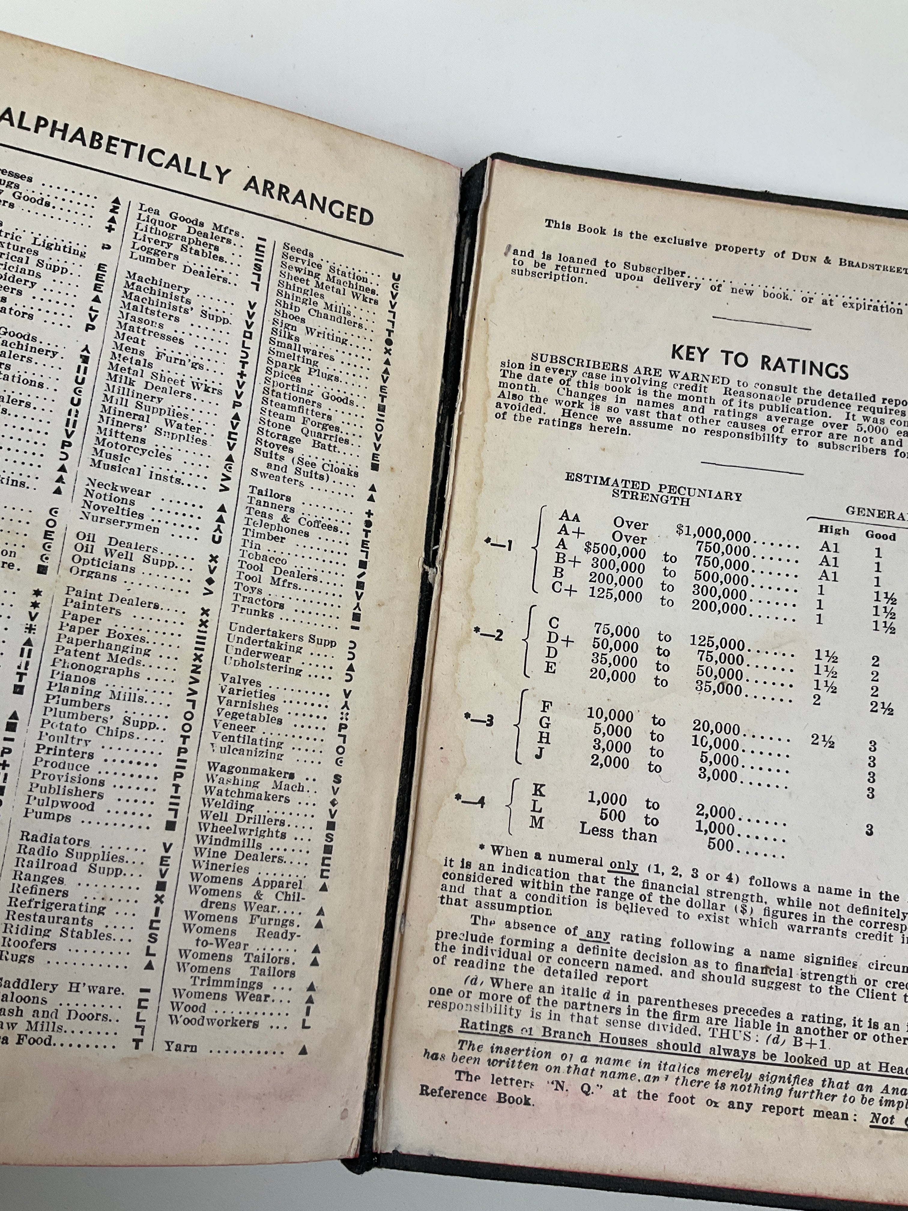 A quarterly commercial directory issued by Dun & Bradstreet, designed to assist firms in evaluating the reliability and financial standing of prospective trading partners. This 1936 Western Provinces edition surveys businesses across Alberta, British Columbia, Manitoba, and Saskatchewan, with a short supplementary section for the Yukon. Entries list company names, lines of trade, and the agency’s proprietary credit classifications. The volume is completed by useful appendices outlining banking centres, financial institutions, and prevailing collection regulations.
