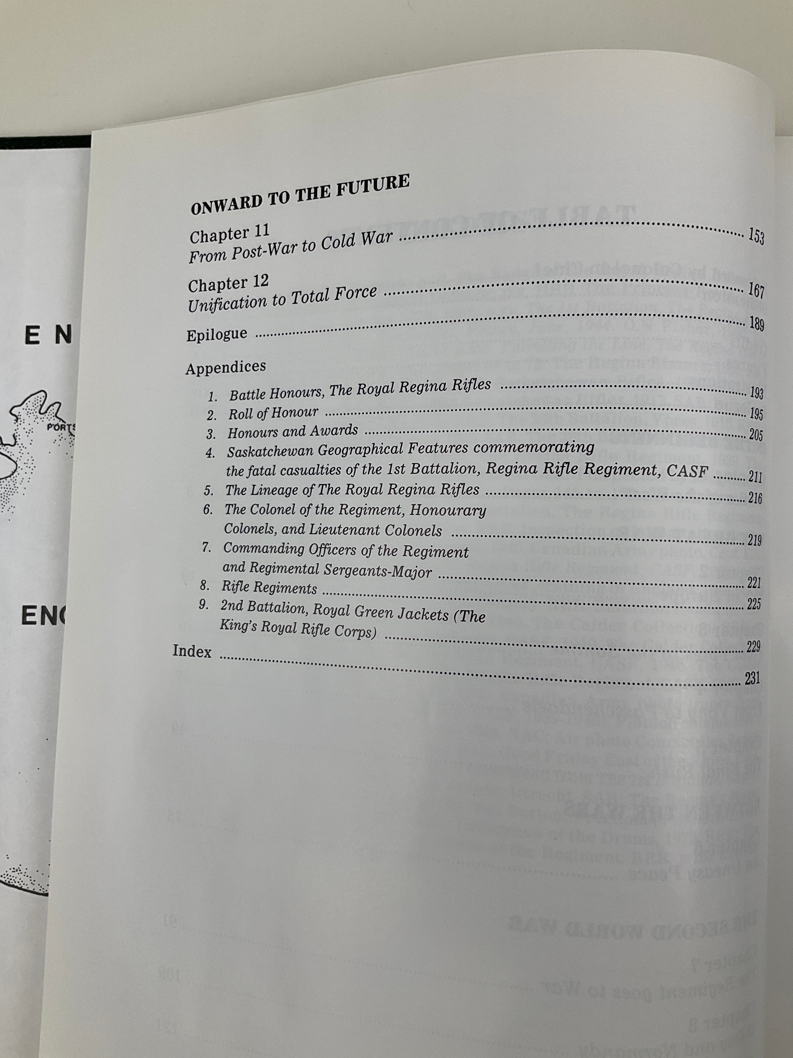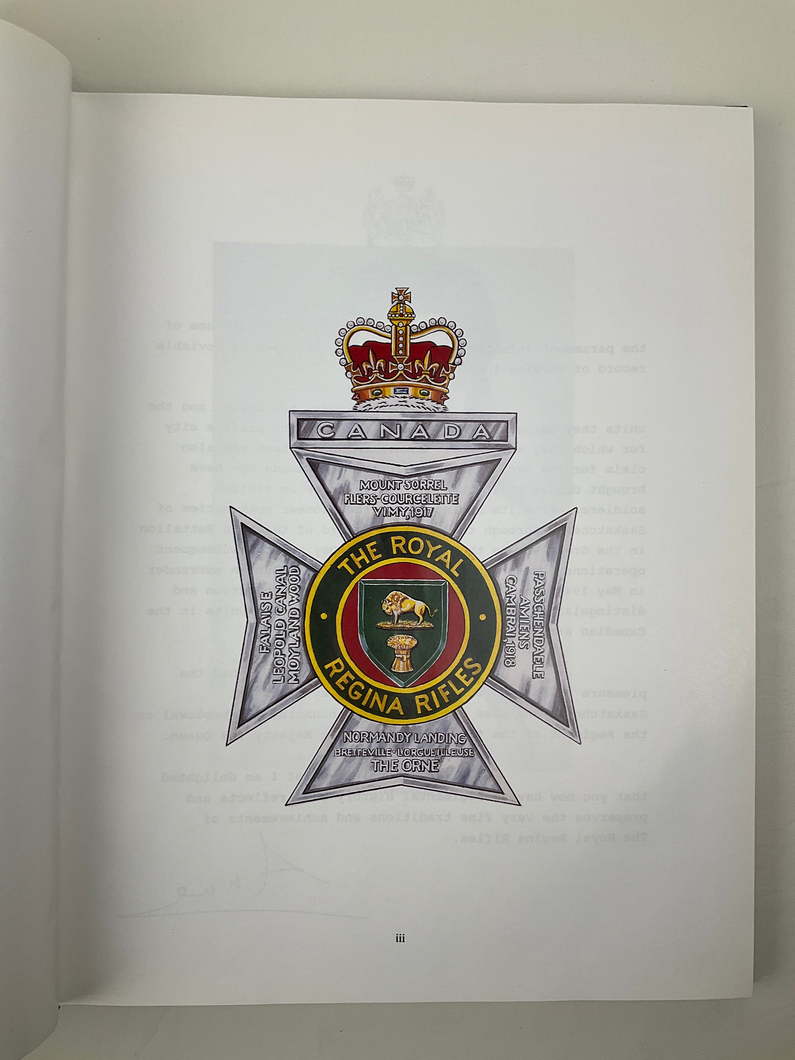 Taken from Regina Rifles website: "Initiated in 1989 to commemorate the 45th anniversary of the Regiment's participation in the D-Day landing and to acknowledge the 75th anniversary of the outbreak of World War I and the 50th anniversary of the outbreak of World War II.  Draws on the Luxton history, as well as The History of the 28th (Northwest) Battalion, CEF, October 1914 to June 1919, an unpublished (though widely circulated) manuscript by Donald Scott-Calder on the active battalion raised by the regiment in WW I.  Scott-Calder later became the Regimental Historian of the Regina Rifles.  Provides coverage of the full history of the regiment, from it's militia roots to current operations at the time of writing."