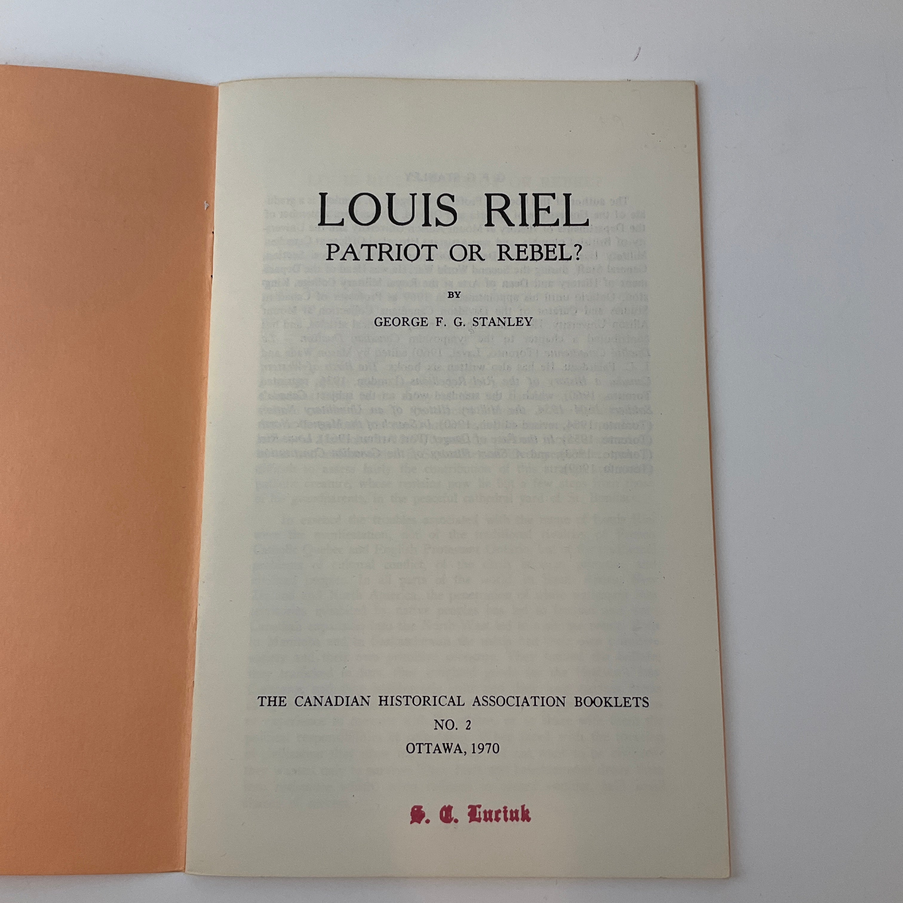 The Canadian Historical Association developed its Historical Booklet series to “provide the general reader, the teacher and the historical specialist with concise accounts of special historical problems” (27). In this booklet (#2), George F. G. Stanley addresses Louis Riel’s legacy and questions the root causes of the North-West Resistance. The book scrutinizes Riel’s role in guiding Métis grievances against the newly formed Canadian government from 1869 through 1885. By outlining key figures and events in the conflicts that led to the Resistance, Stanley suggests that the movement Riel led was not so much a copy of French-English tensions in eastern Canada as it was a clash of civilizations as Europeans moved westward, displacing First Nations groups in the process.