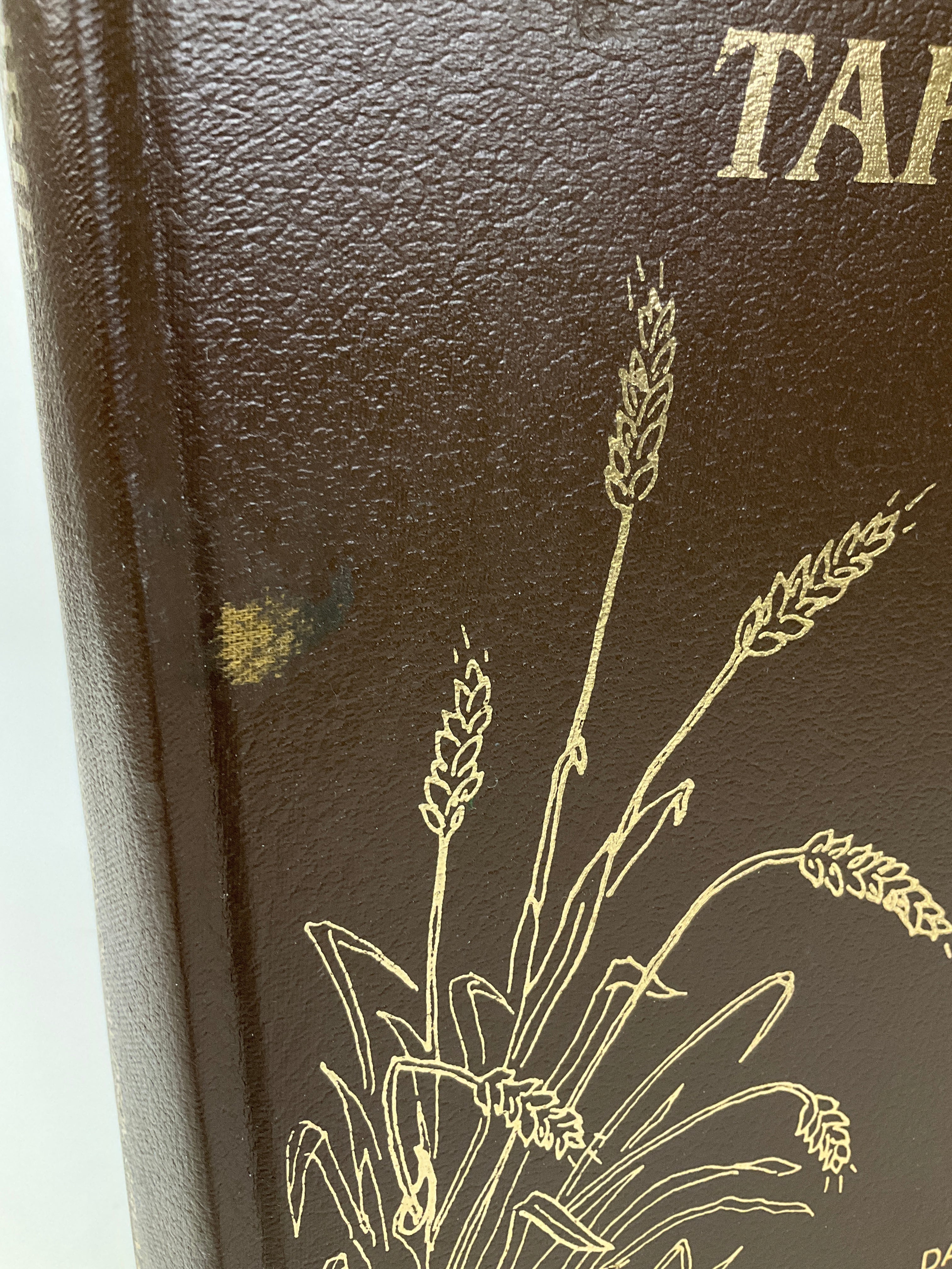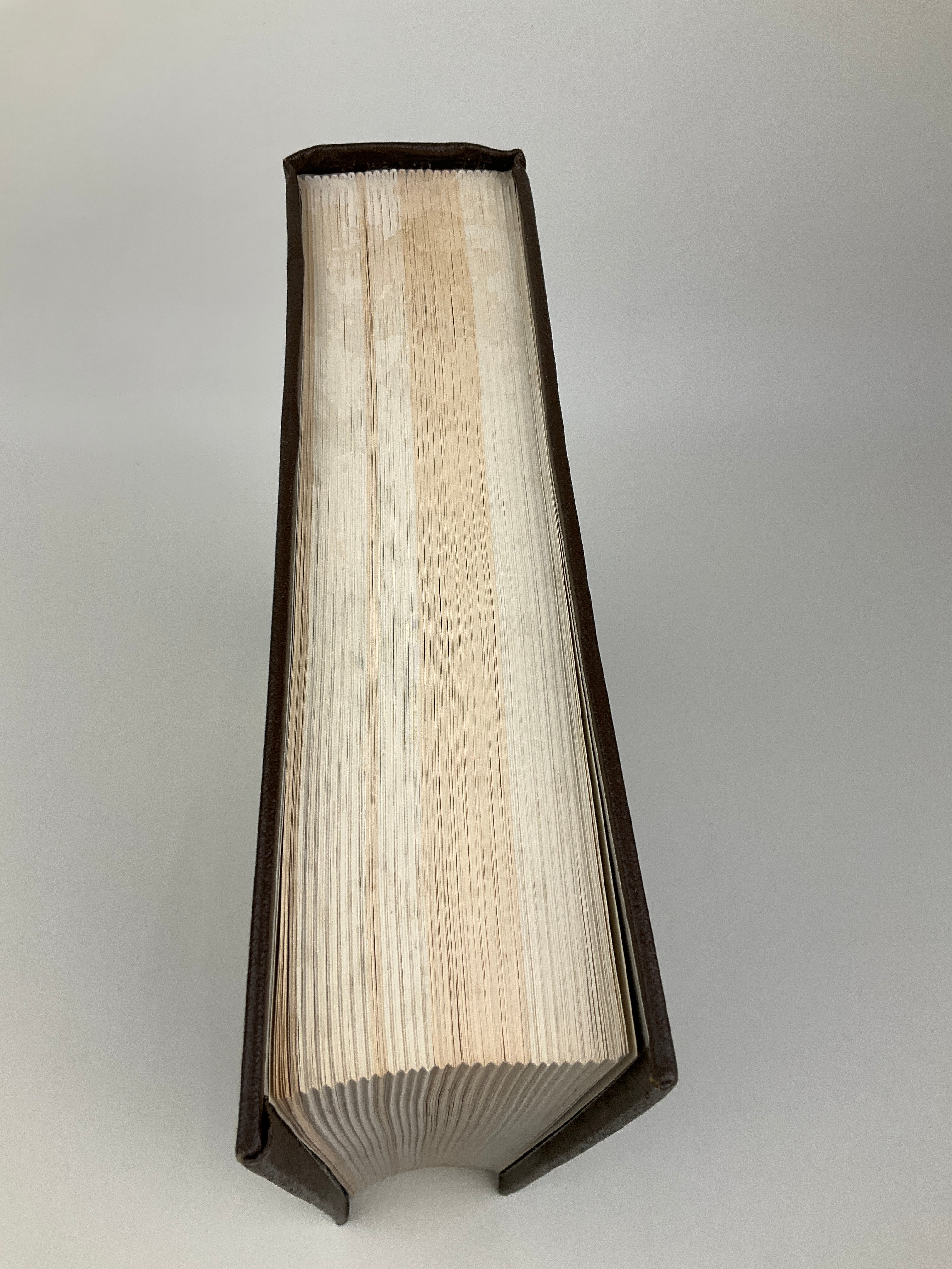 Four mall divots and stain on front cover, two long indents on back cover, top and foreedge soiled and dust stained.