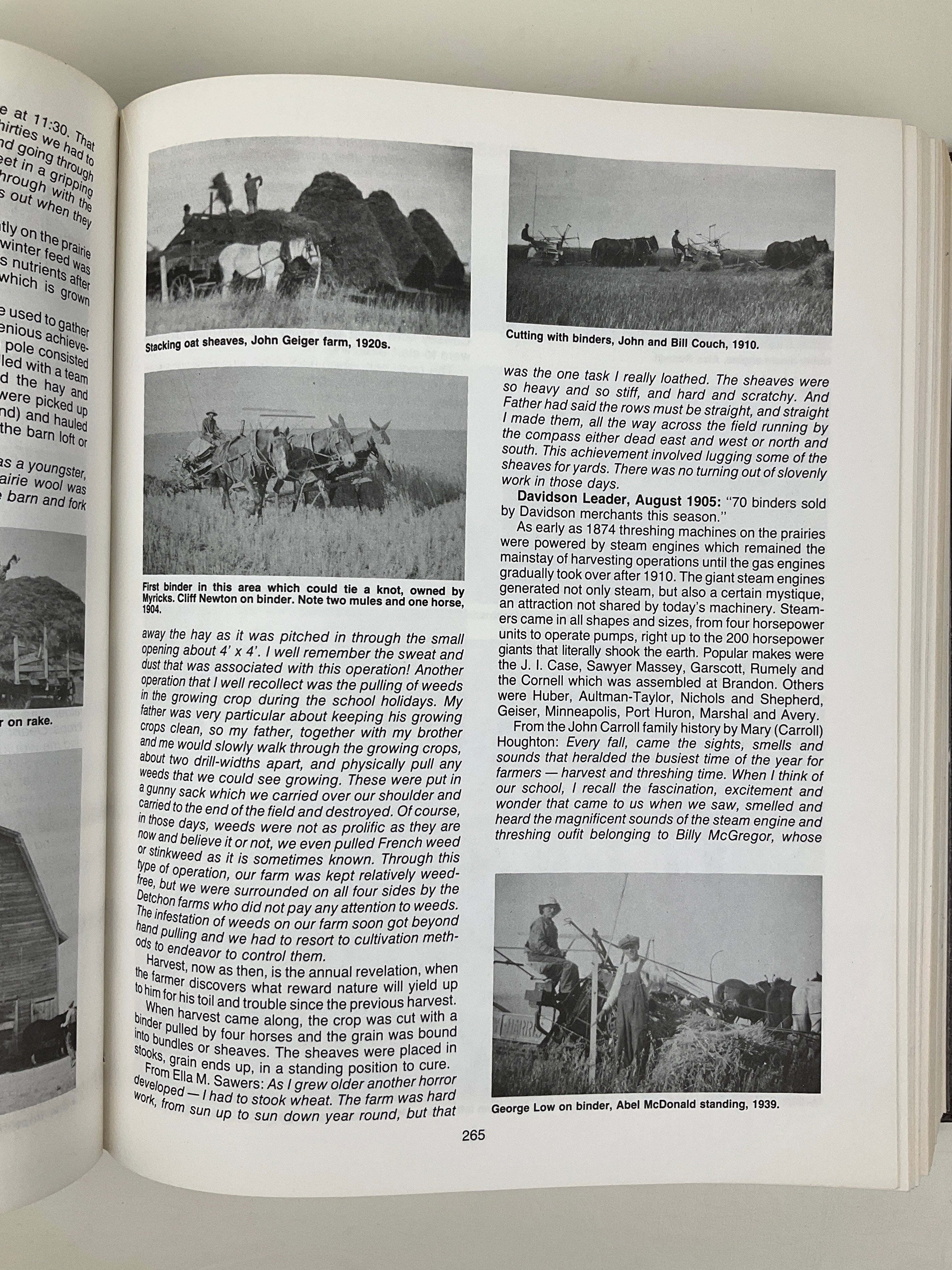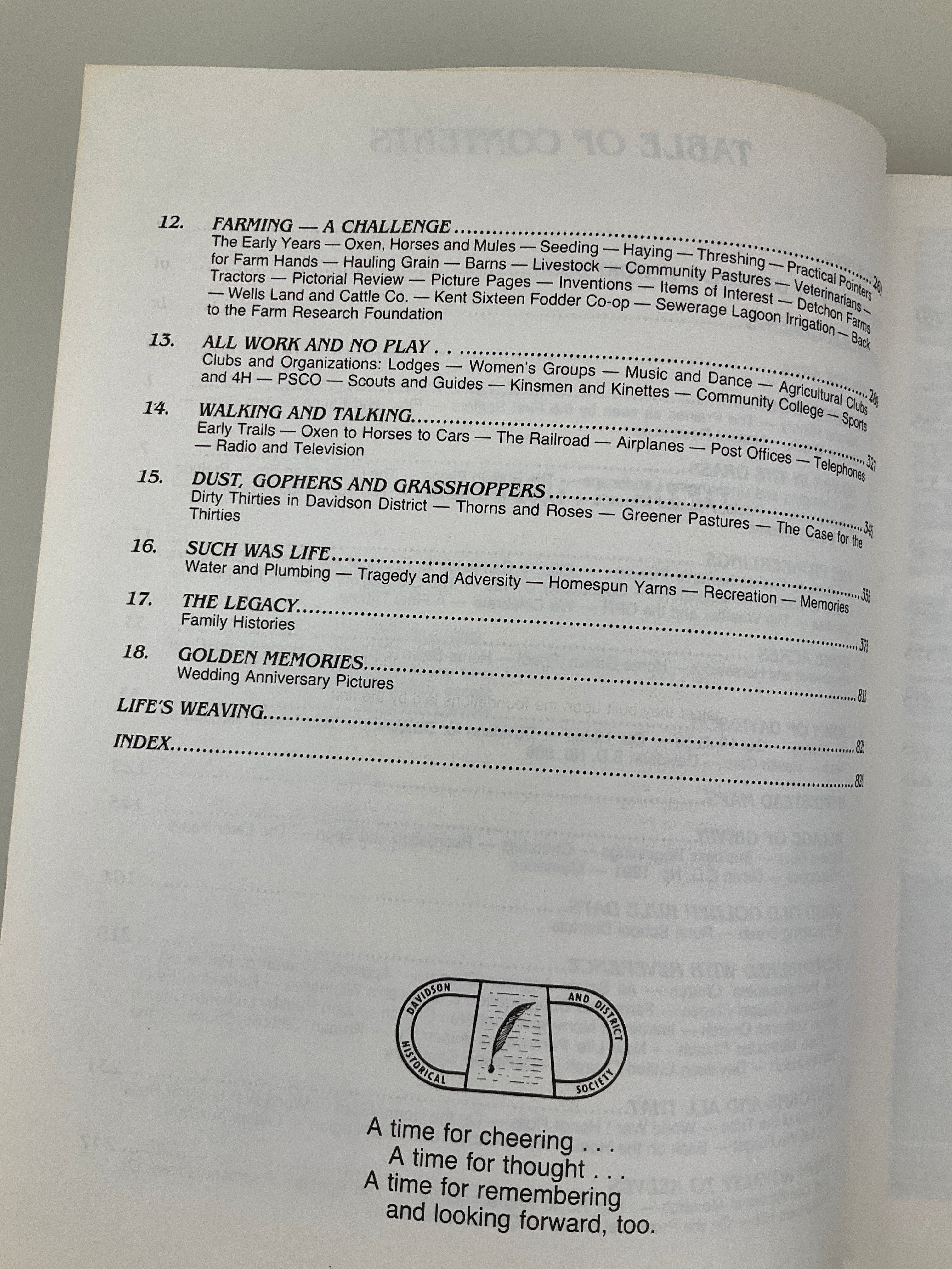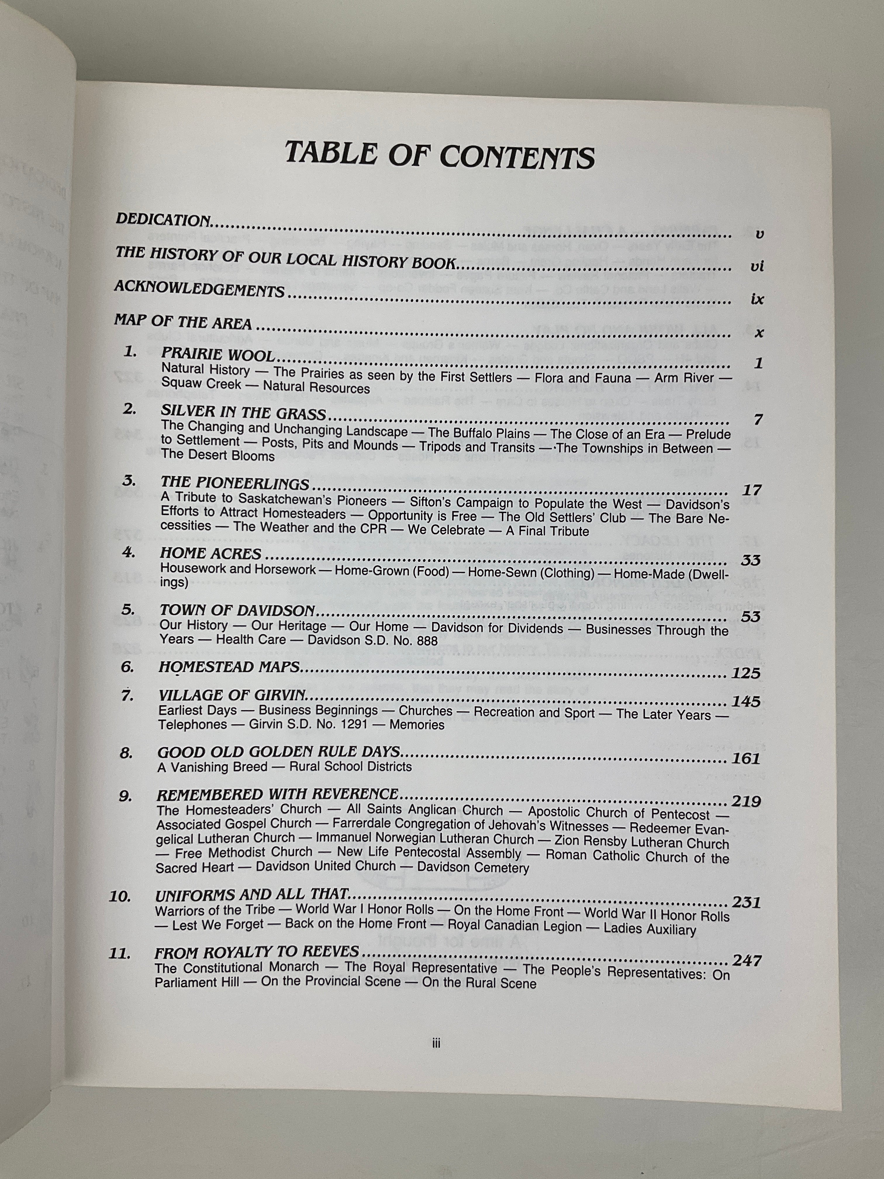 This volume contains a community history of the districts surrounding the town of Davidson and the former village of Girvin (in Saskatchewan’s Rural Municipality of Arm River #252). The book opens with section maps indicating original owners and chapters covering the area’s geography, early homesteading experiences, and Girvin and Davidson’s histories (including history of Davidson’s Union Hospital). Topical chapters on local agriculture, churches, organizations, schools, services, and transportation appear as well. The majority of the volume consists of family histories contributed by area residents. Includes index.