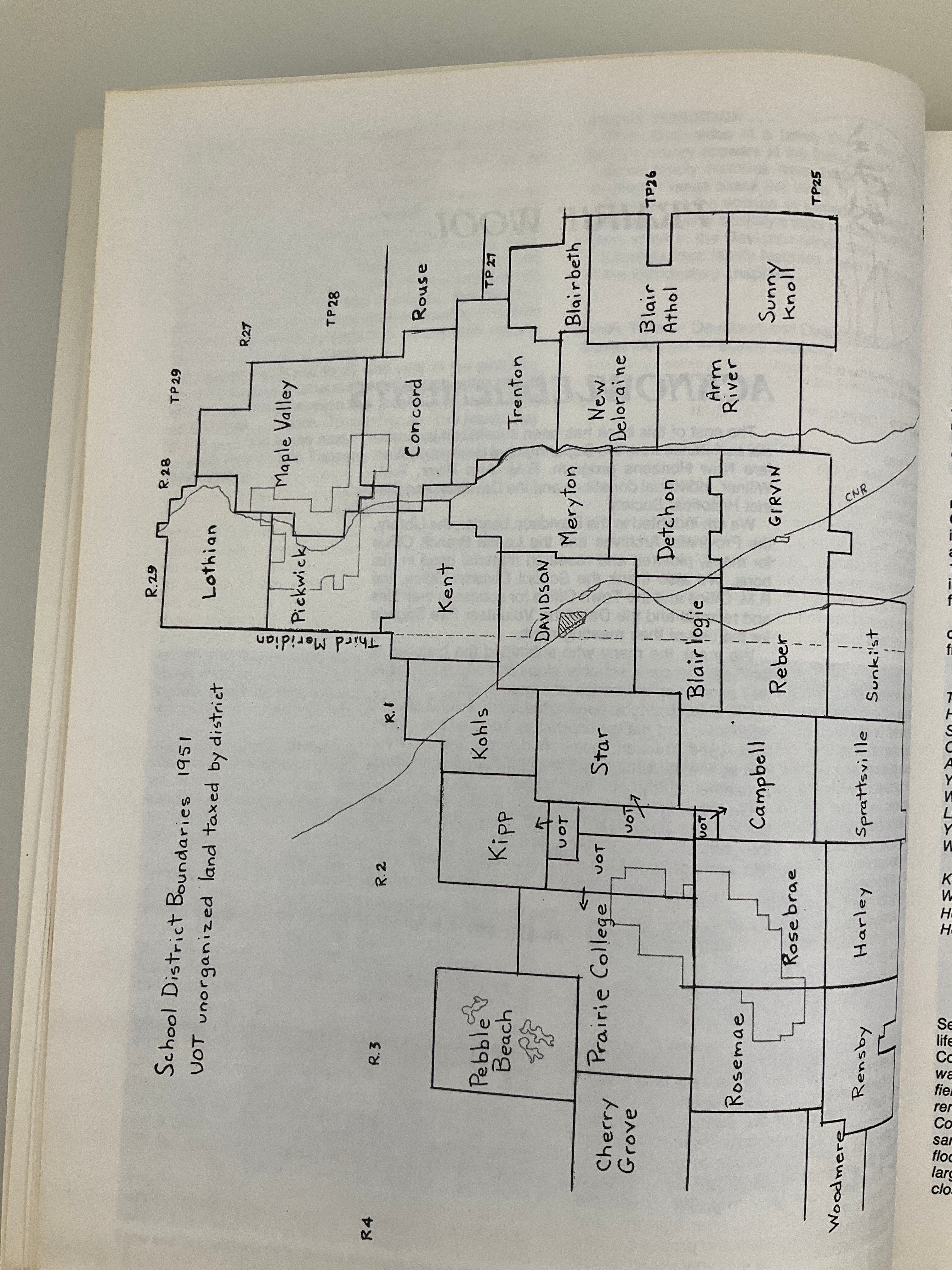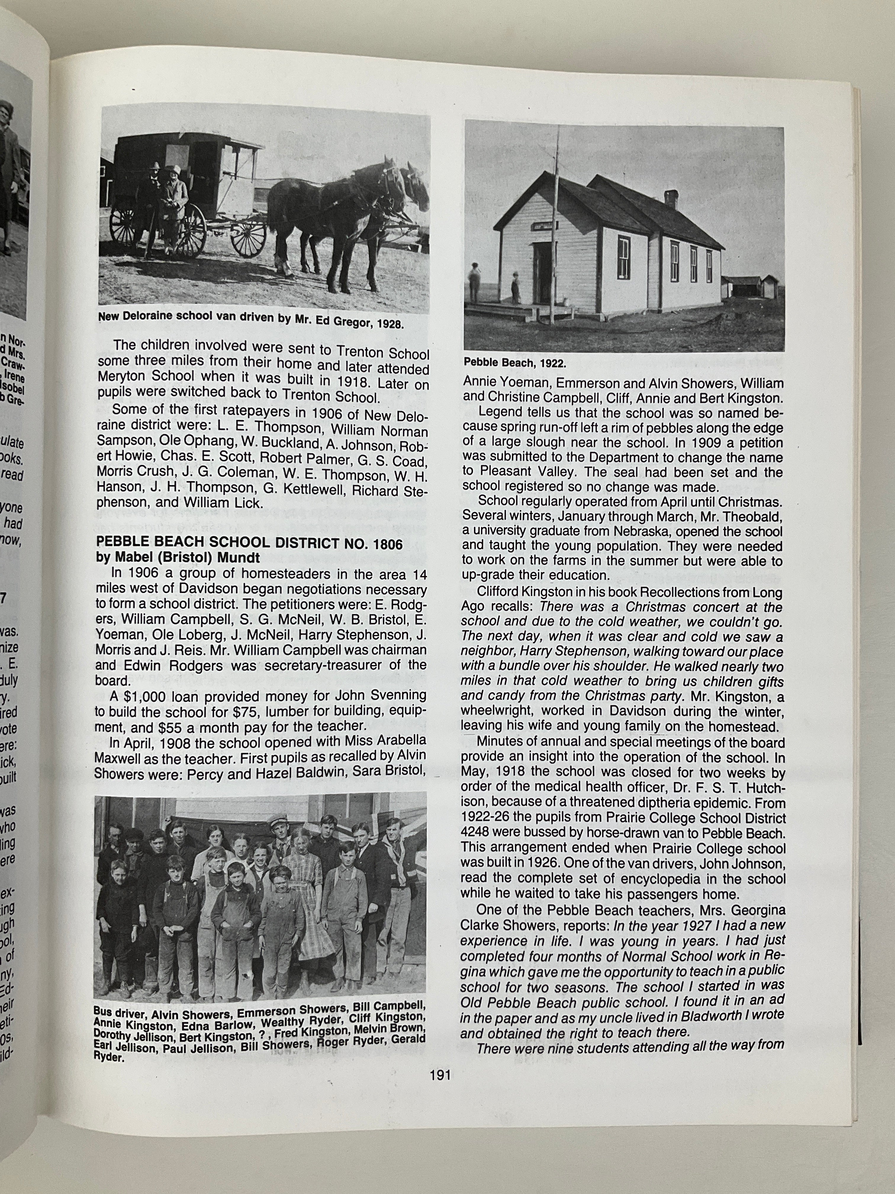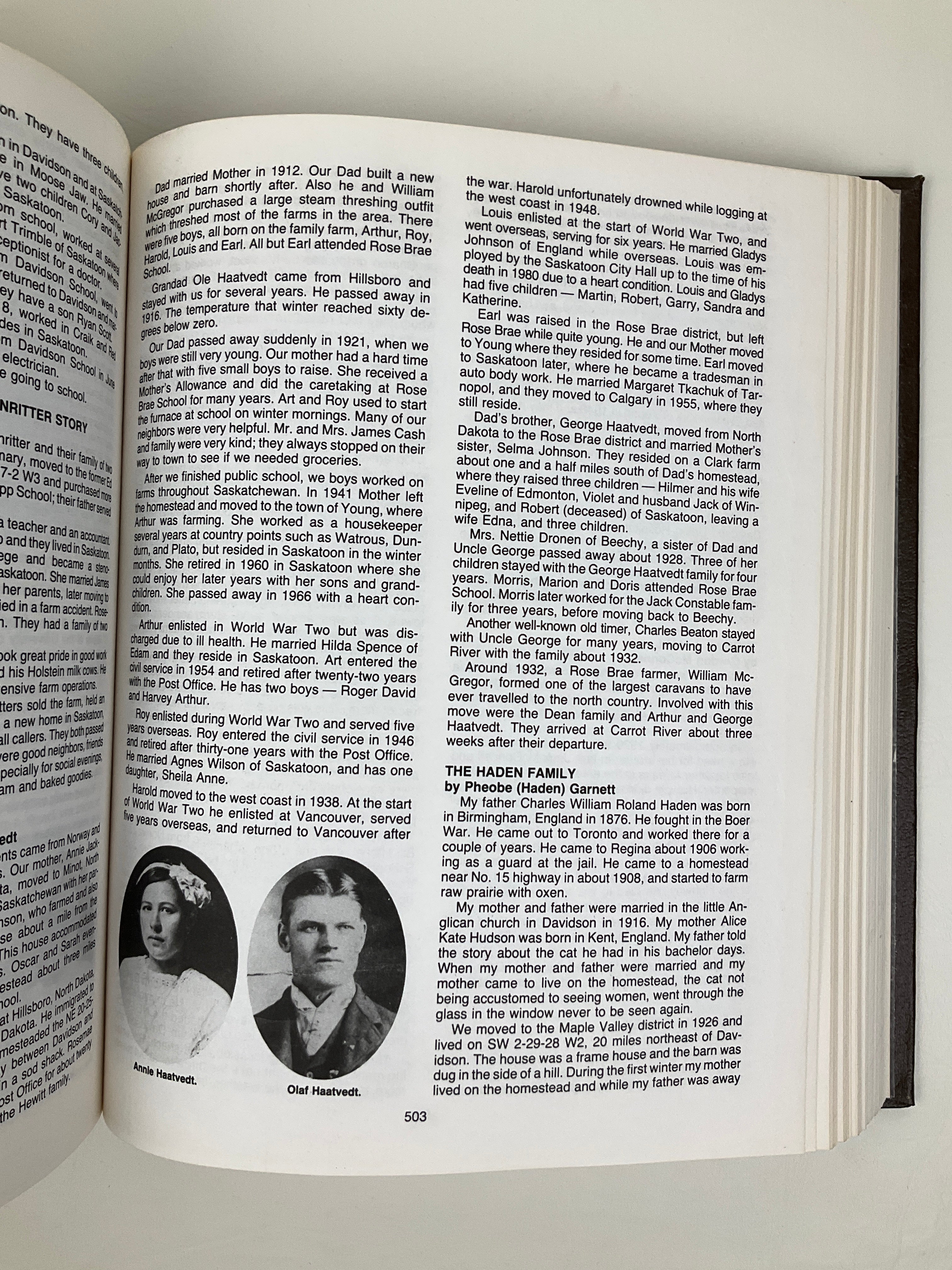 This volume contains a community history of the districts surrounding the town of Davidson and the former village of Girvin (in Saskatchewan’s Rural Municipality of Arm River #252). The book opens with section maps indicating original owners and chapters covering the area’s geography, early homesteading experiences, and Girvin and Davidson’s histories (including history of Davidson’s Union Hospital). Topical chapters on local agriculture, churches, organizations, schools, services, and transportation appear as well. The majority of the volume consists of family histories contributed by area residents. Includes index.