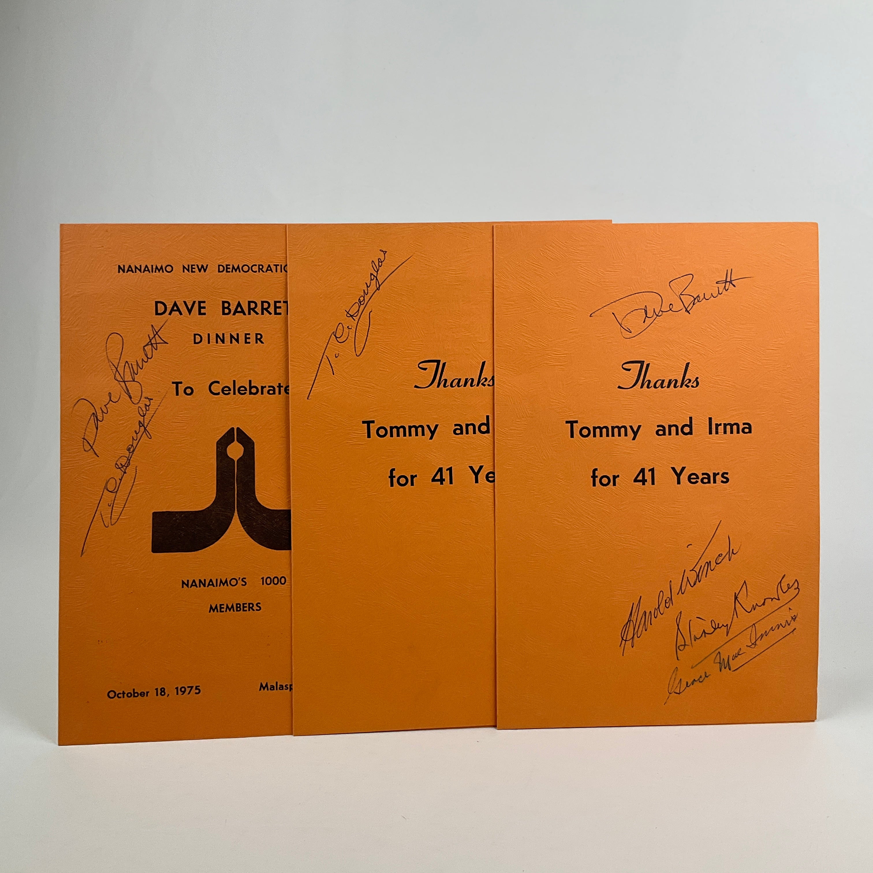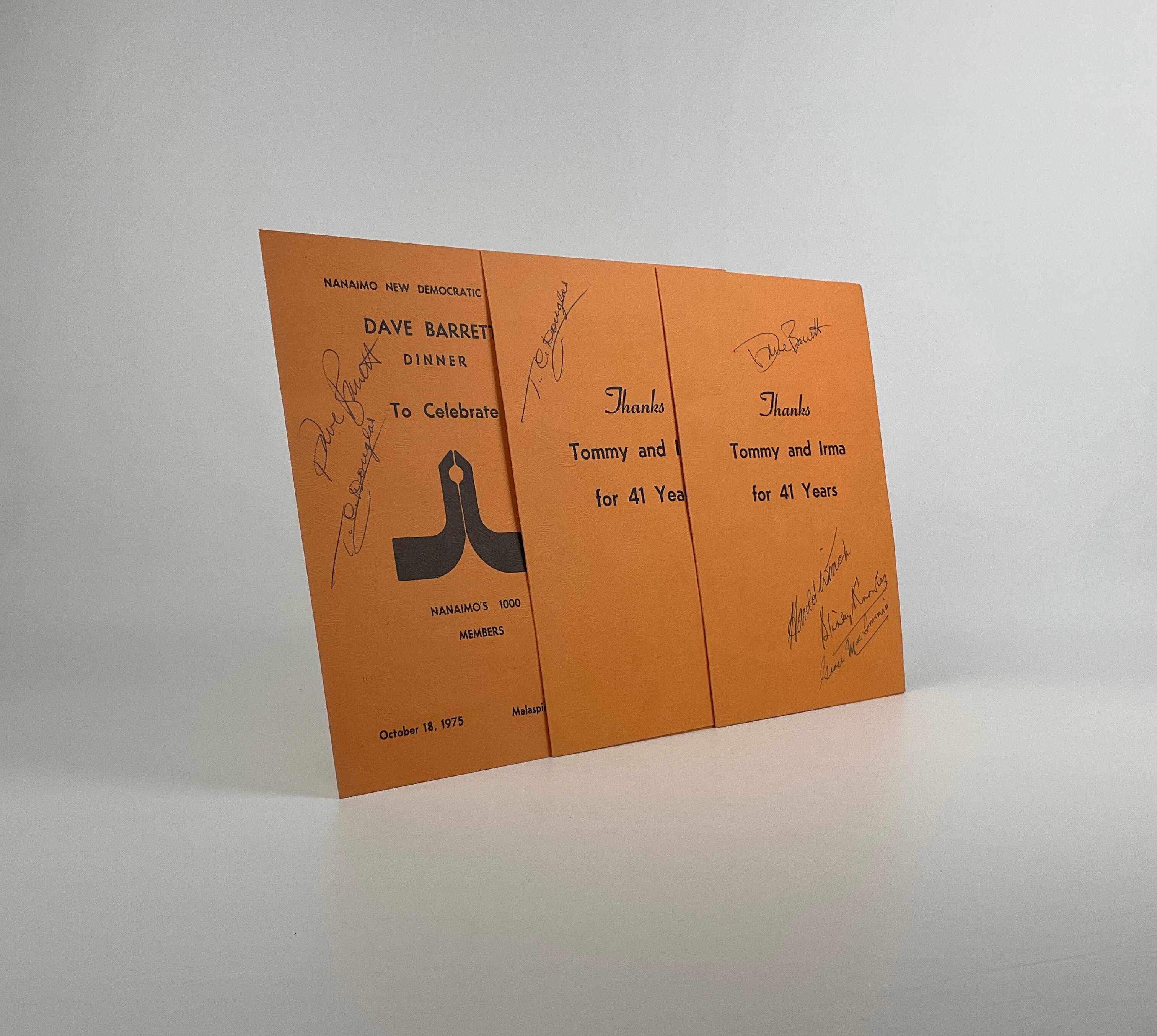 Front cover signed by Dave Barrett, then Premier of British Columbia, and T. C. Douglas, then sitting Member of Parliament for Nanaimo–Cowichan–The Islands.