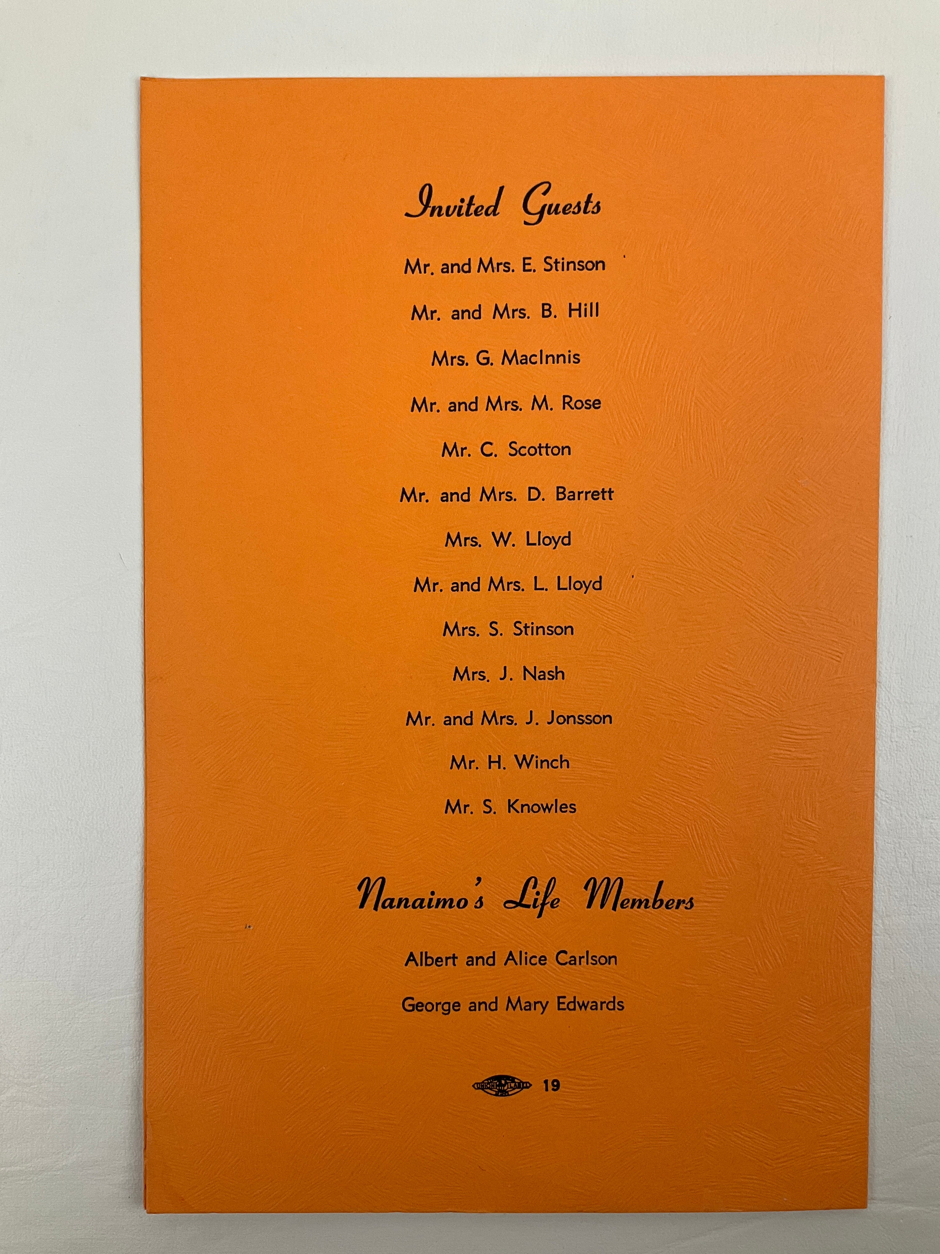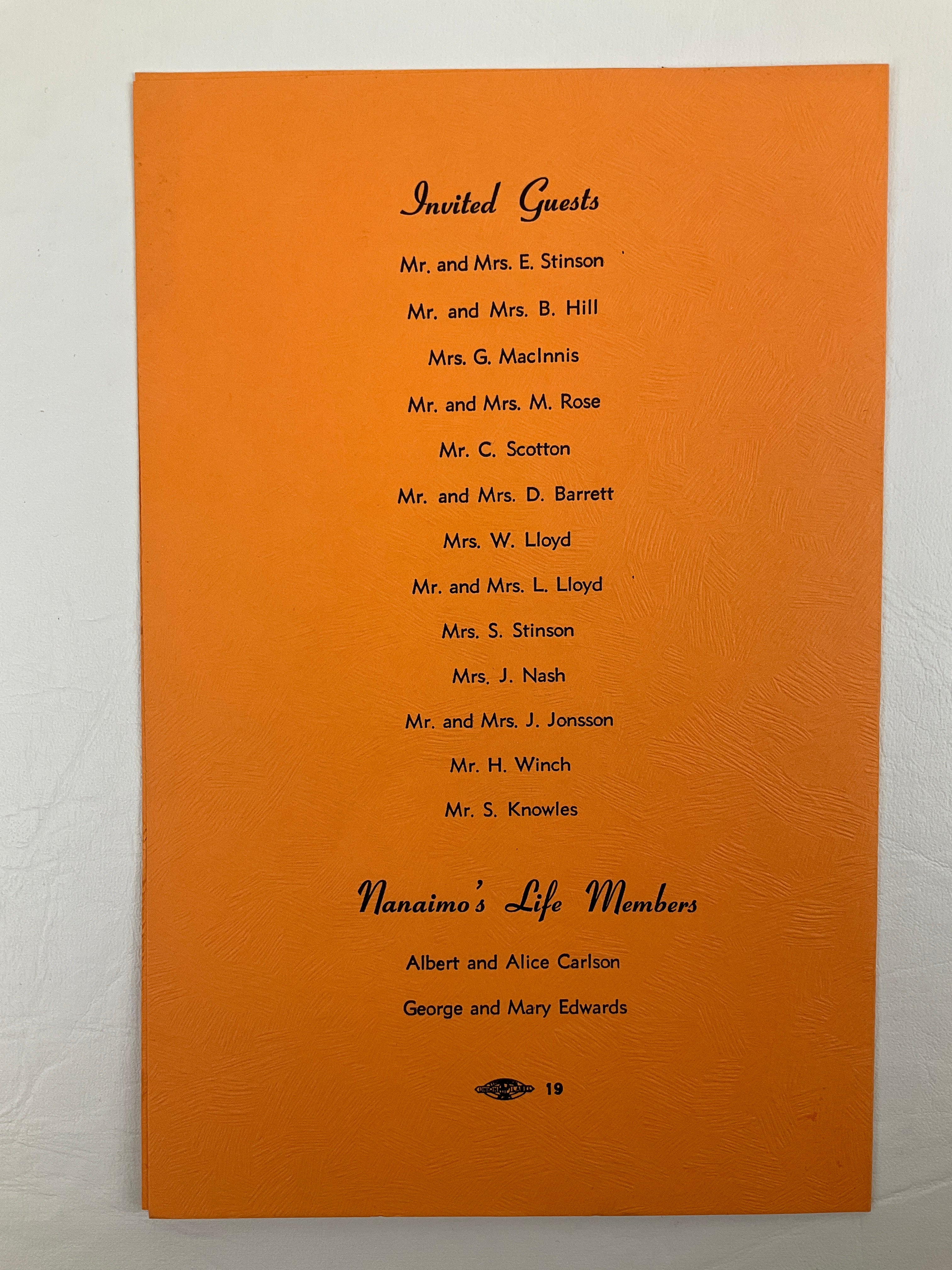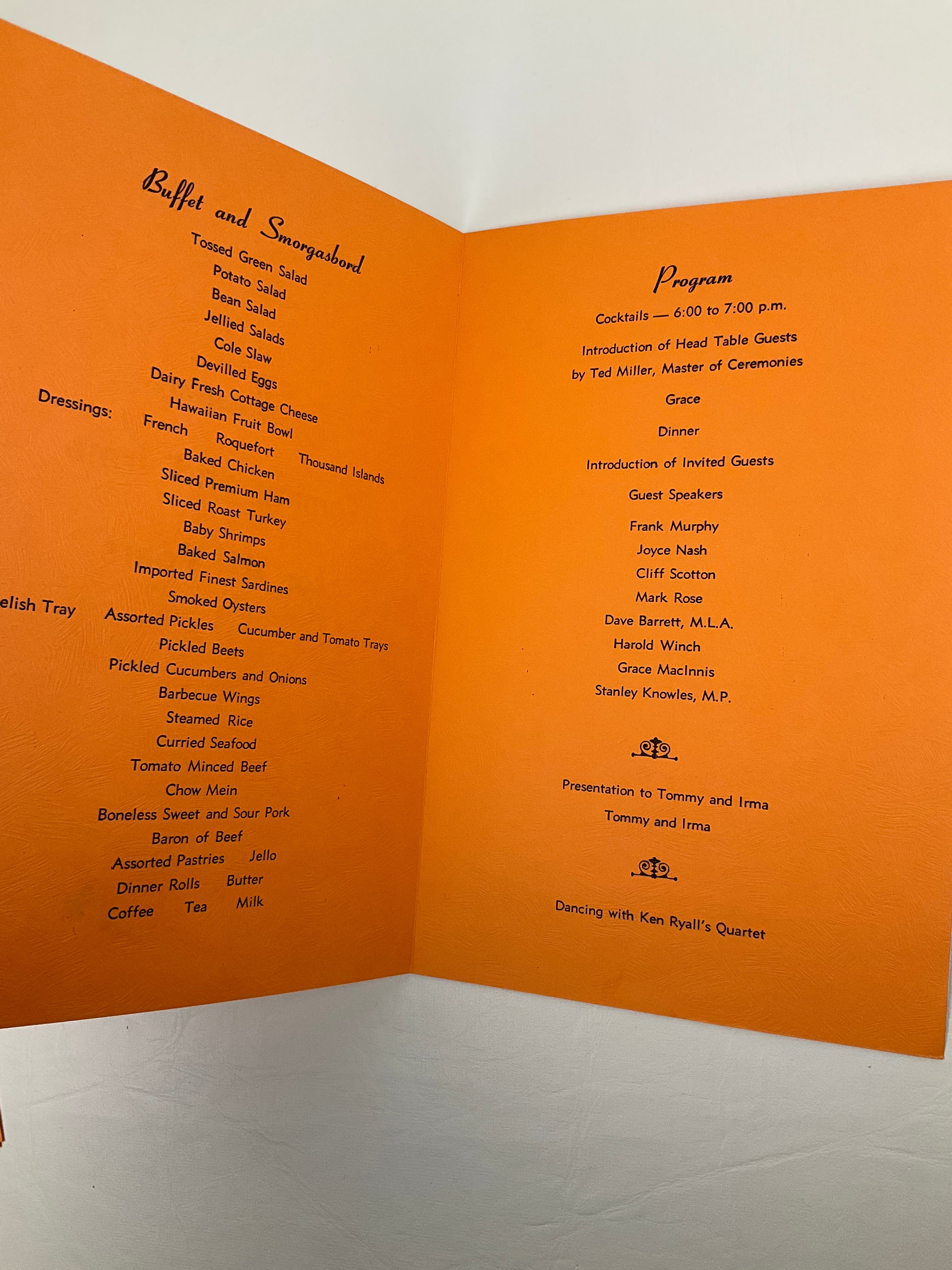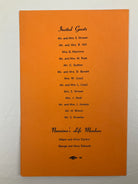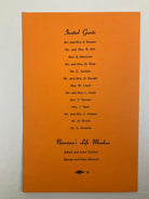 Programme for the evening’s events, with the programme on the recto and a menu of buffet and smorgasbord selections on the verso; list of invited guests printed on the rear cover.
