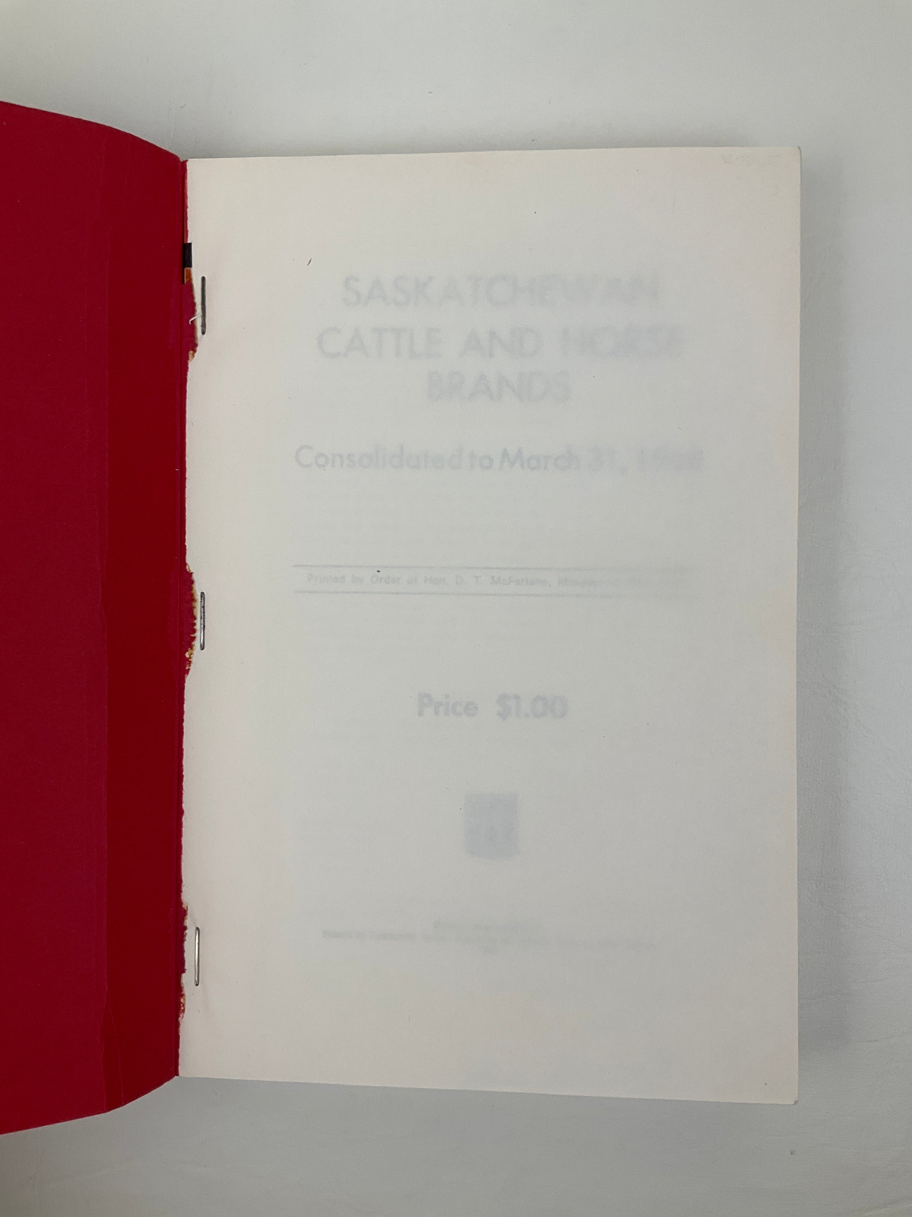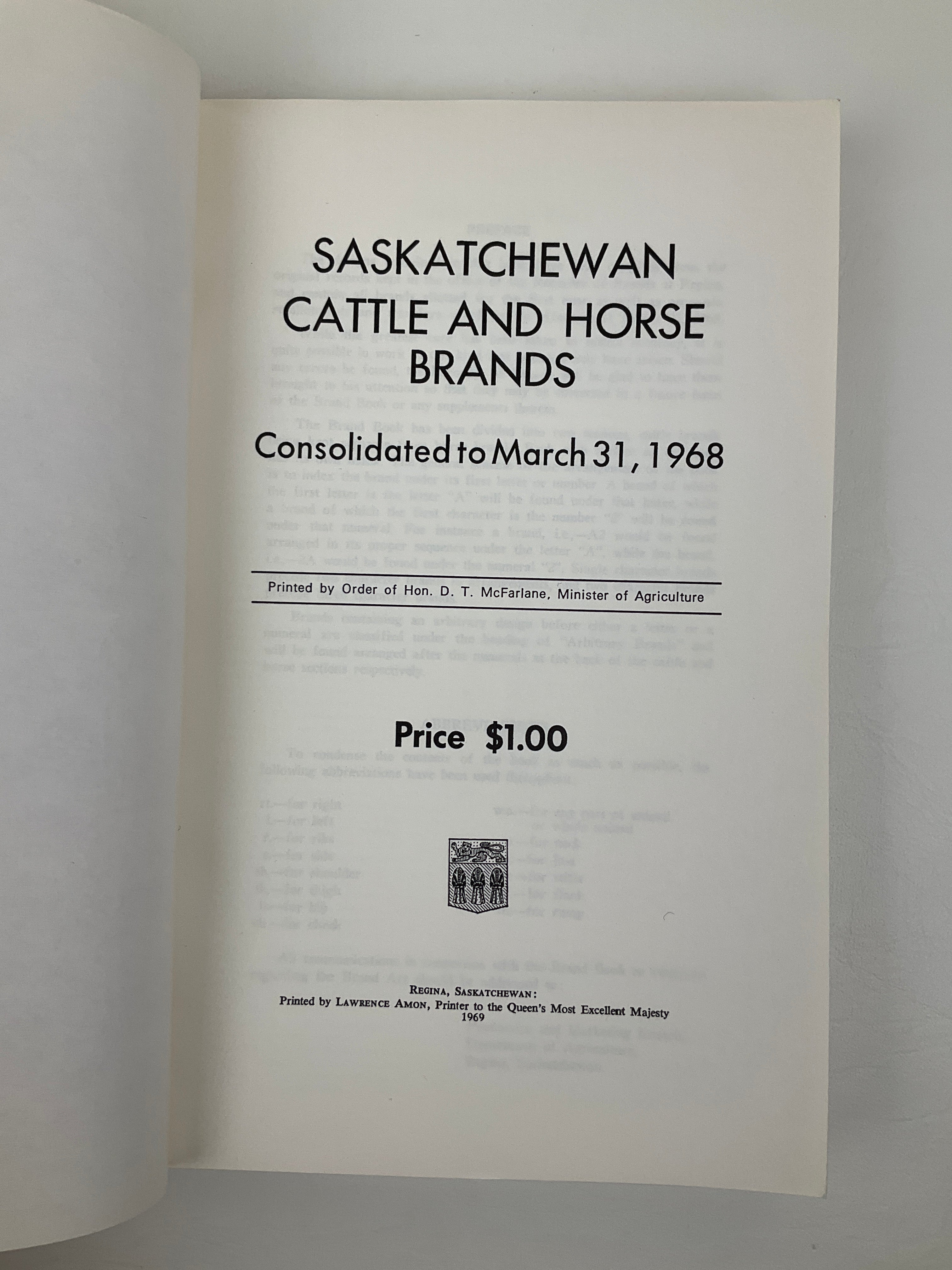 [Saskatchewan Brand Book] Saskatchewan Cattle And Horse Brands : Consolidated To March 31, 1968