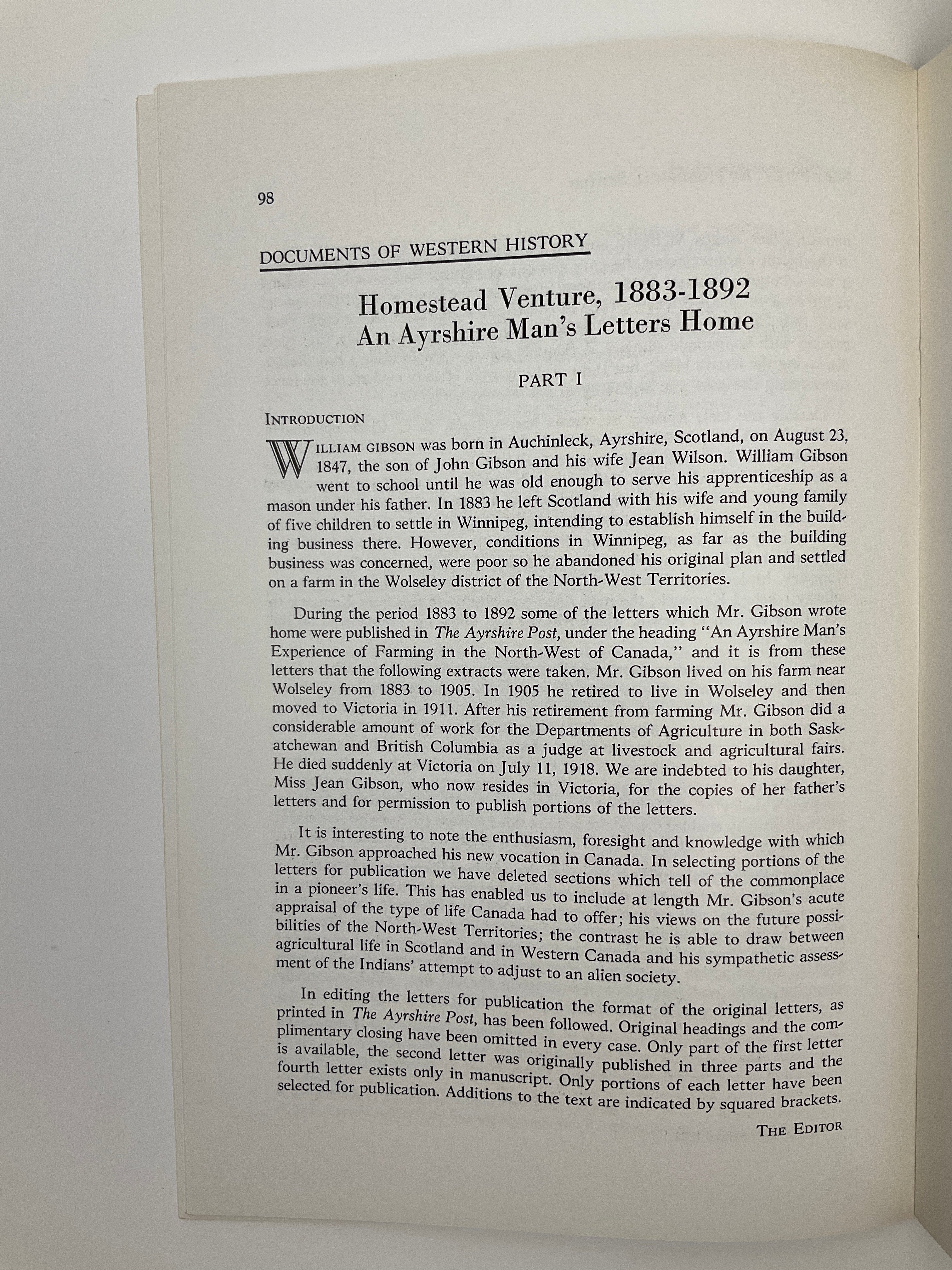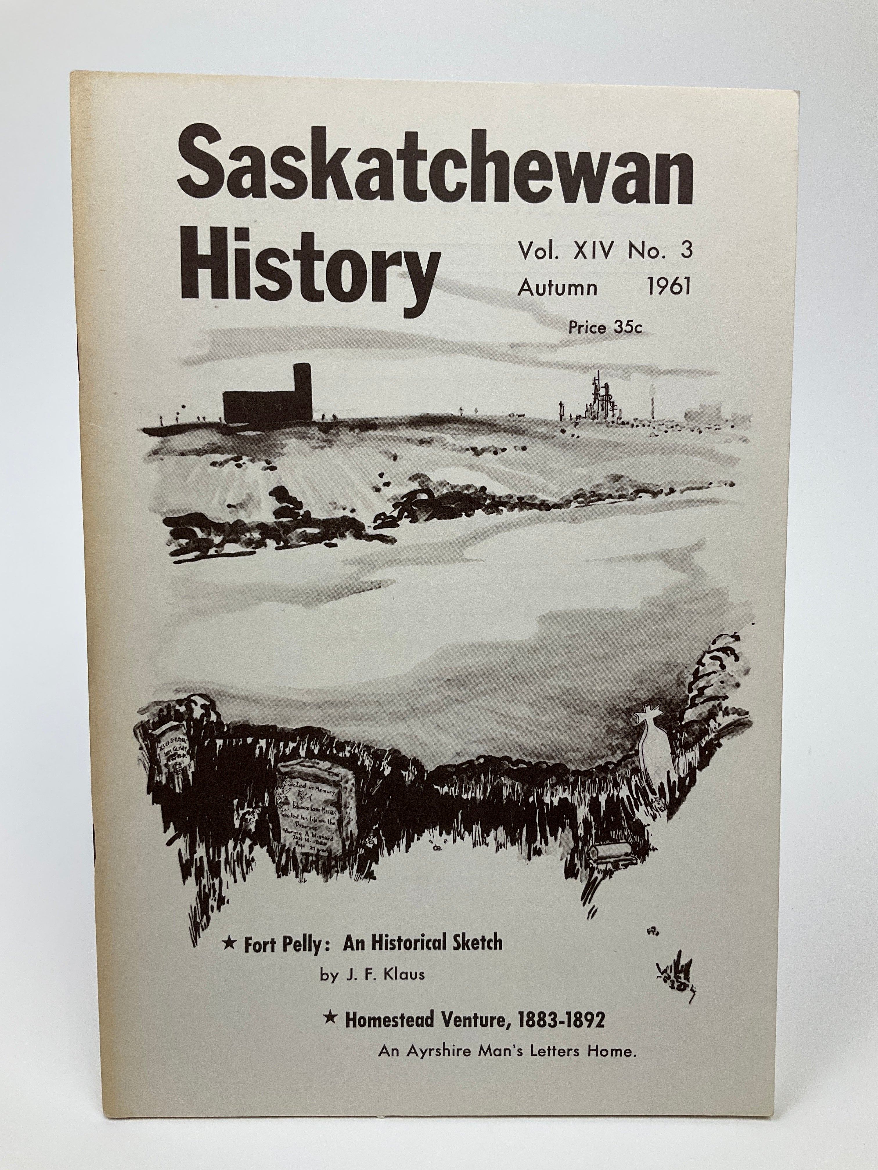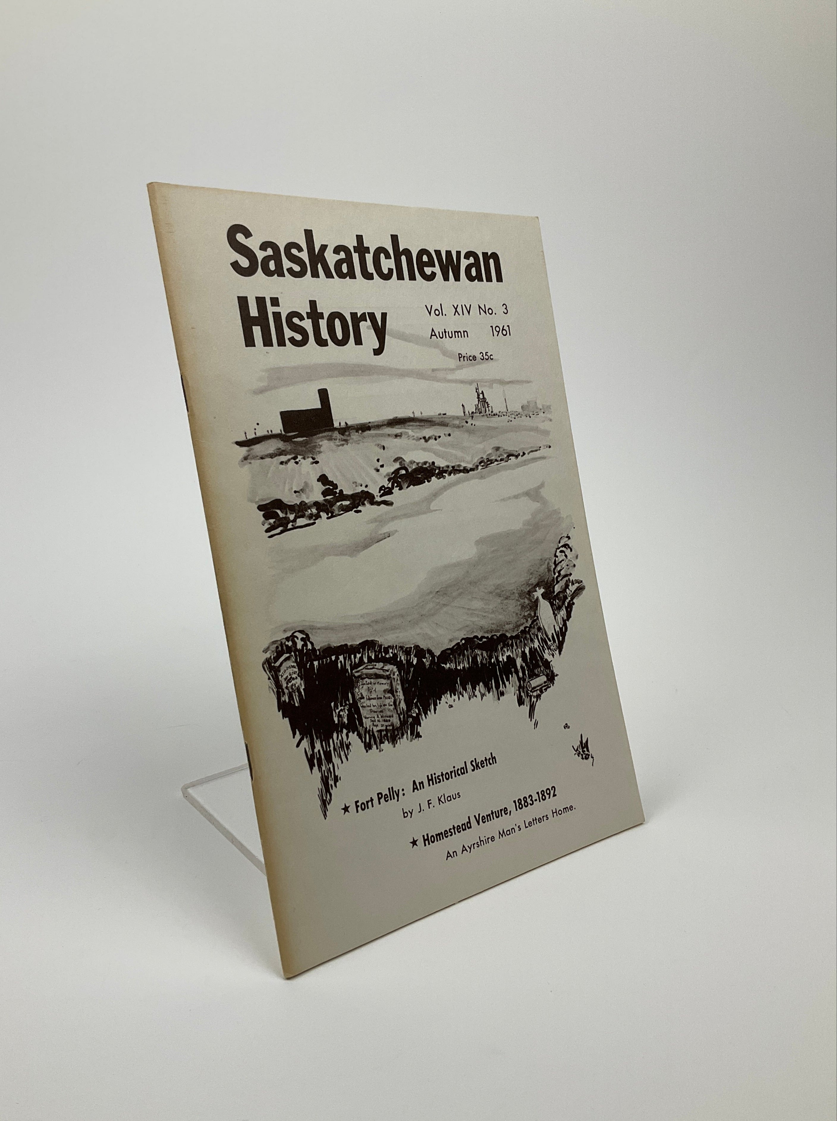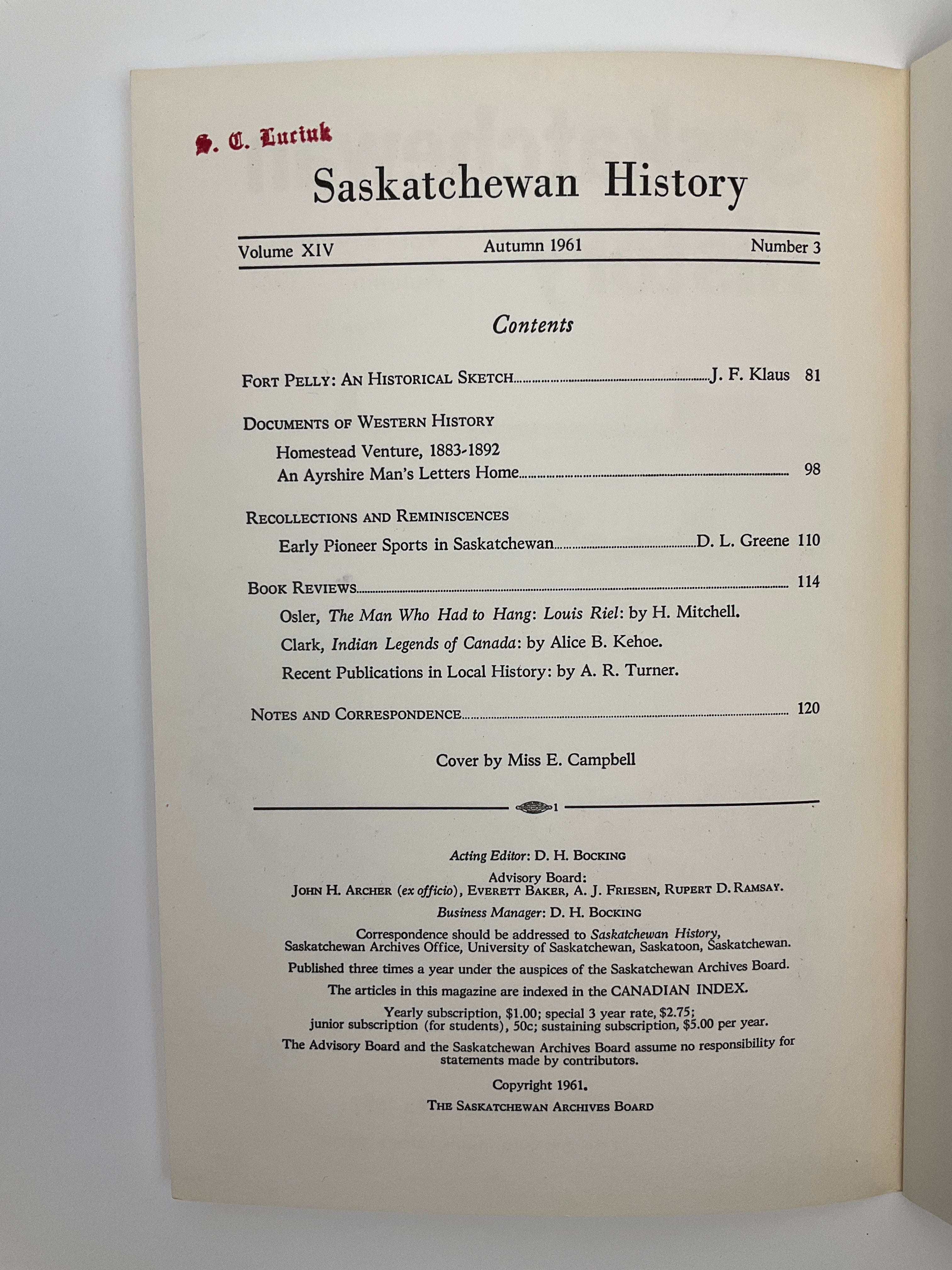 Published from 1948 until 2017, “Saskatchewan History” magazine showcased both scholarly and general interest work on diverse figures, groups, and events in the province’s past. As a publication of the Saskatchewan Archives Board, the magazine invited submissions from archivists, librarians, and academics. Issues may contain scholarly articles, book reviews, archival reports, and reminiscences. This volume includes material on Fort Pelly (a Hudson’s Bay Company post), pioneer sports, and letters describing farming life sent from pioneers back to Scotland. Laid in is a “Saskatchewan History Gift Subscription Form.” Cover by Miss E. Campbell.