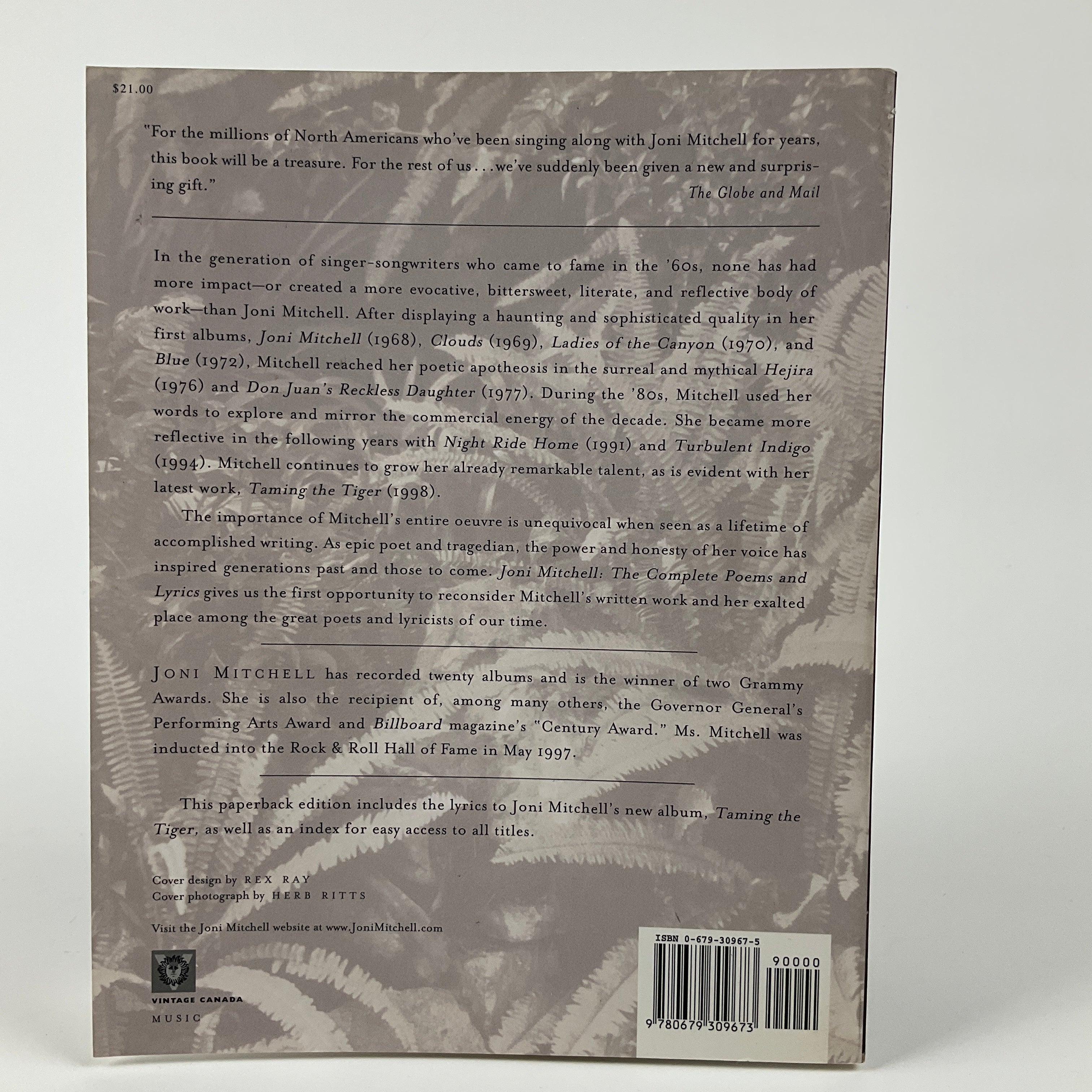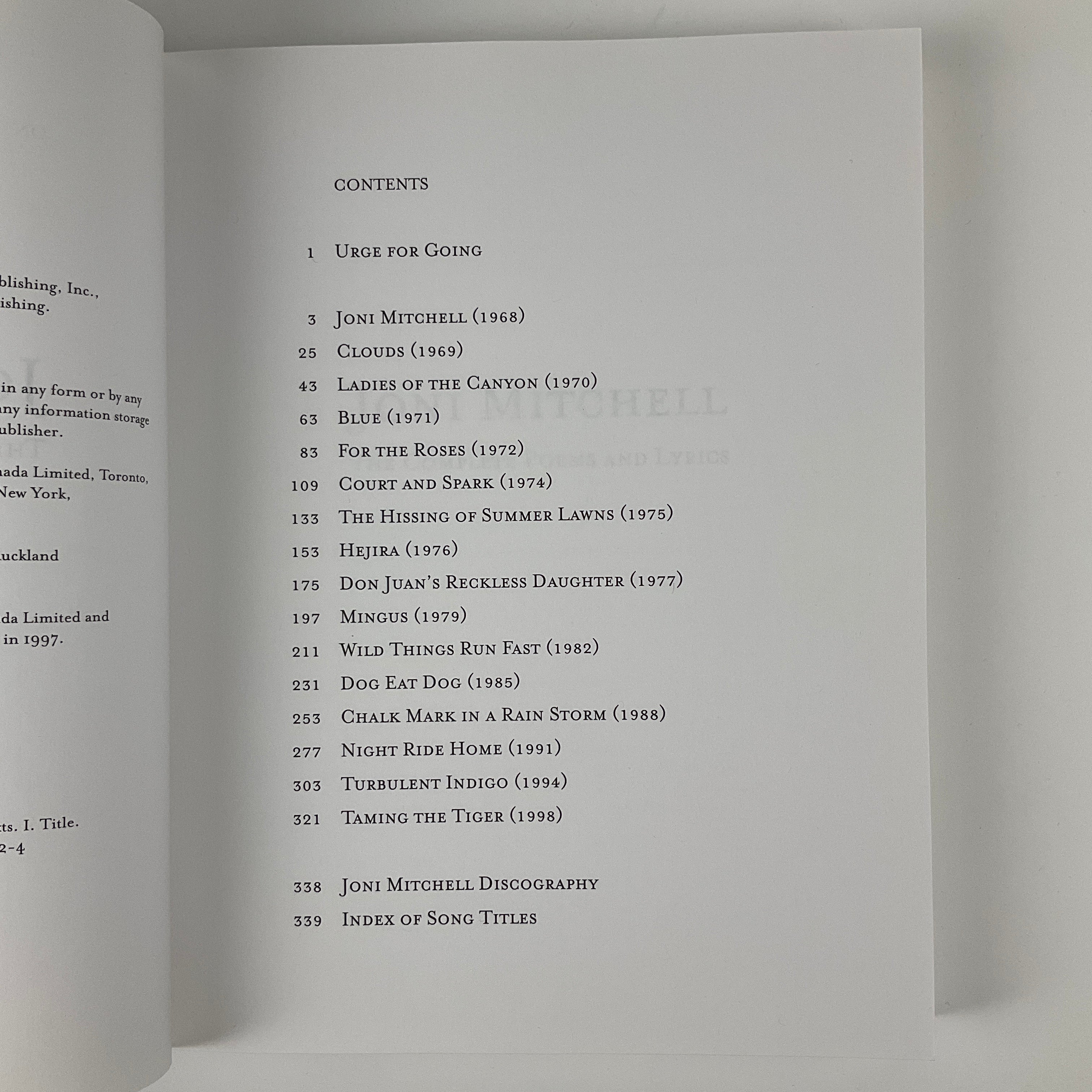 This volume contains the printed lyrics for all songs from Canadian musician Joni Mitchell's first 16 studio albums (up to and including 1998's "Taming the Tiger"). Songs are grouped by album. Includes song title index.