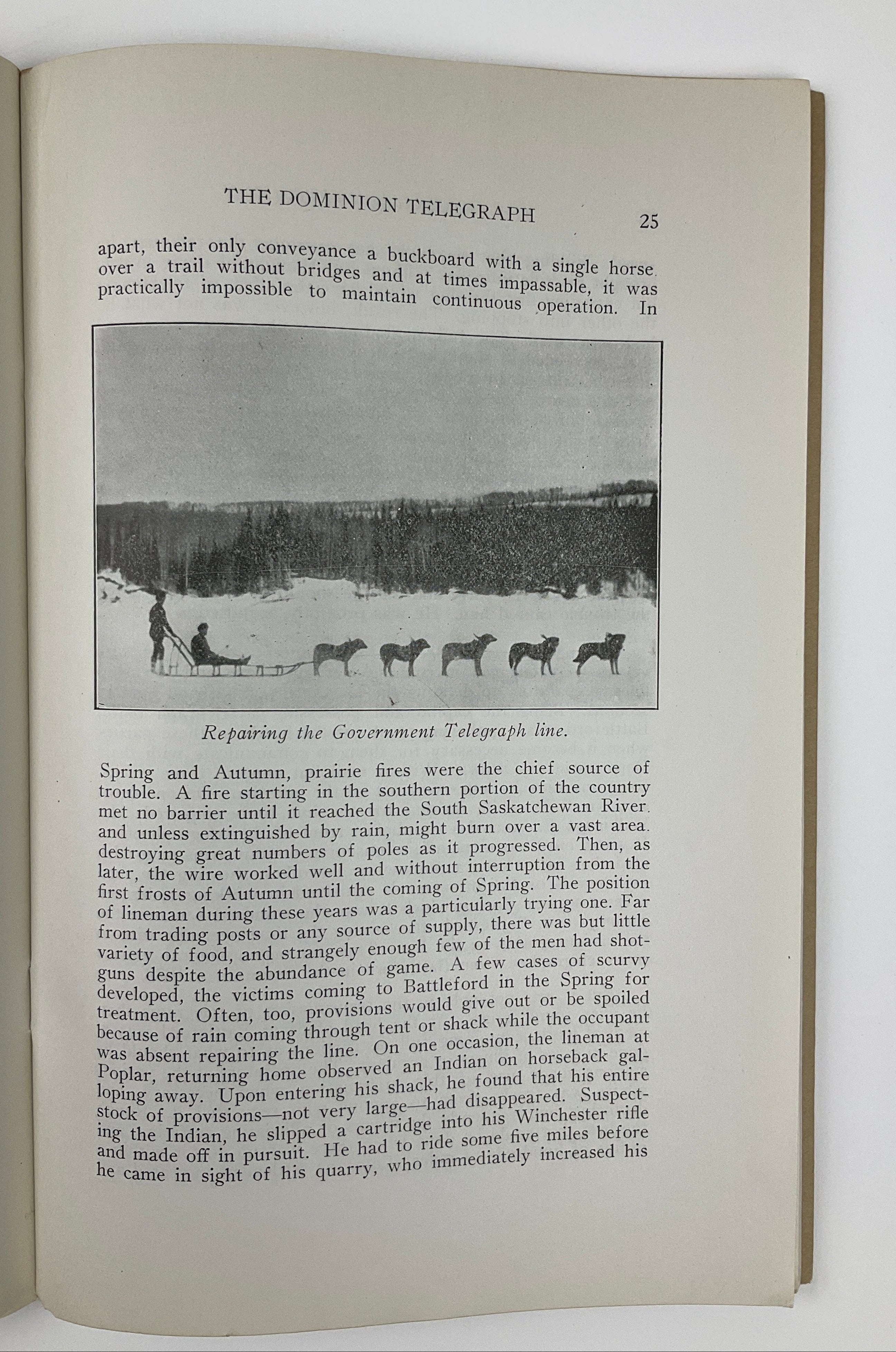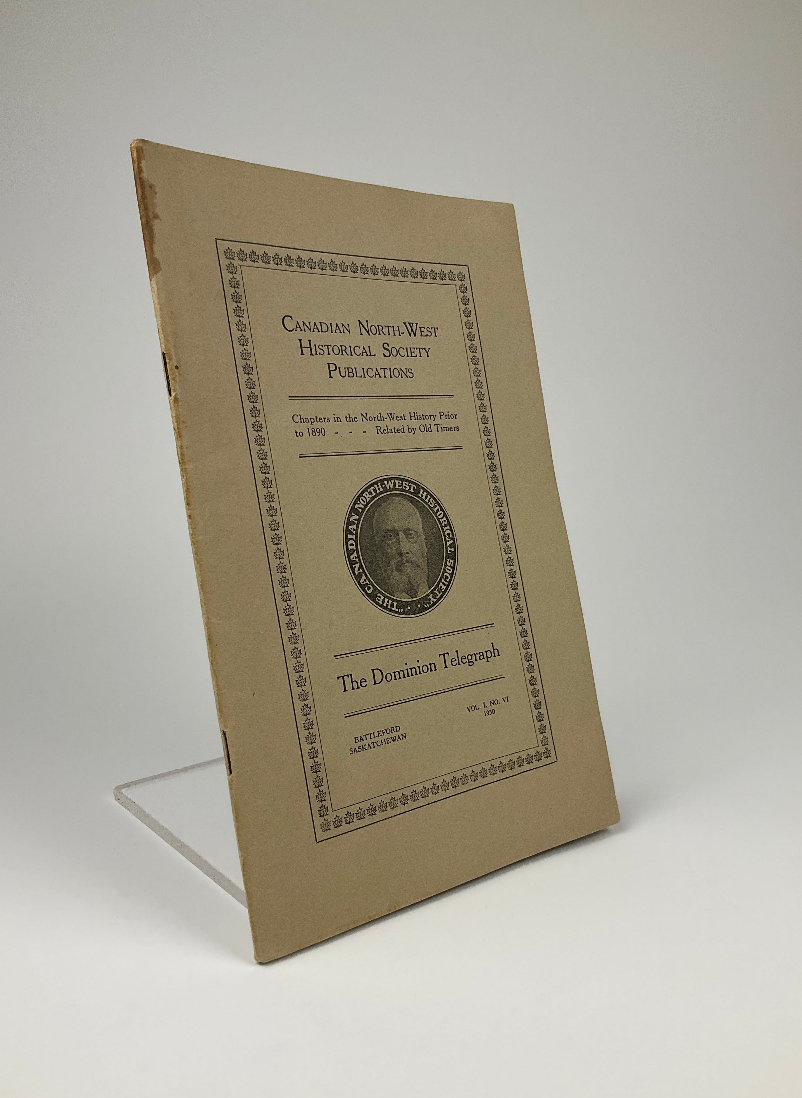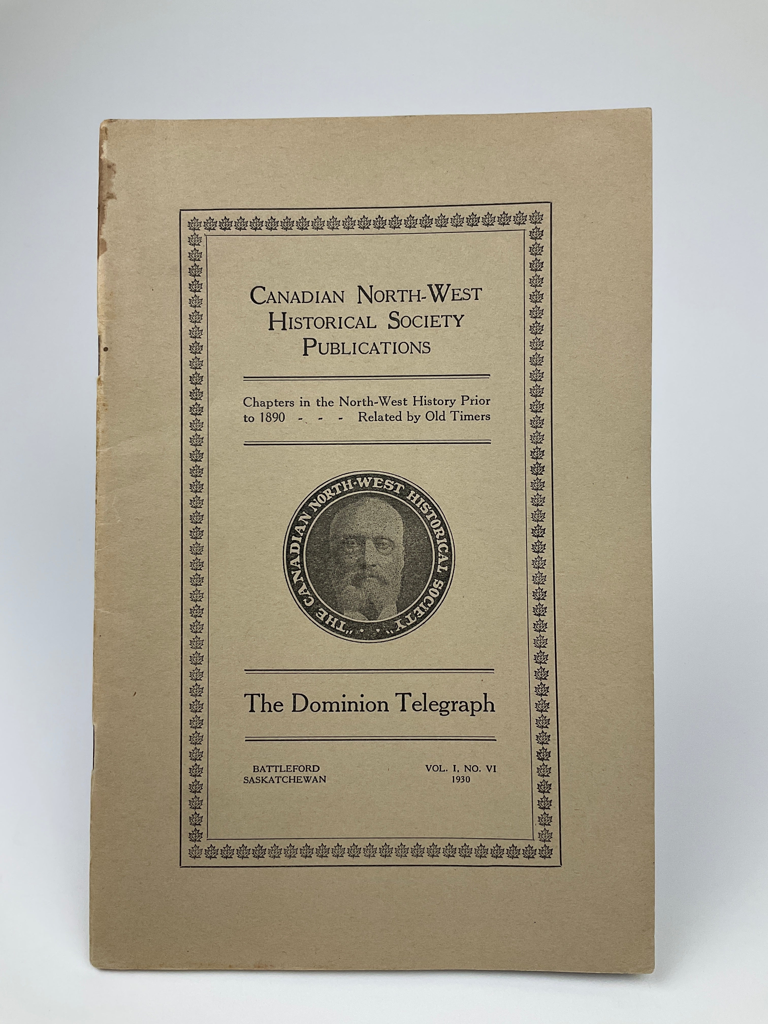 Canadian North-West Historical Society Publications Vol. 1 No. 6. The Canadian North-West Historical Society was founded in 1924 (as the Battleford Historical Society) to preserve the Battleford area’s history, in part by publishing accounts of life in the region prior to 1890. In this volume, J. Stuart MacDonald (an Inspector of the Government’s Telegram Service) details the construction of the Dominion Telegraph line between Manitoba and Edmonton in the 1870s, arguing that its role in changing the North-West rivaled that of the NWMP or the Canadian Pacific Railway. He also highlights the telegraph’s importance during the 1885 North-West Resistance. Includes an introduction by Saskatchewan Premier J. T. M. Anderson, appendices recounting line inspections and Alfred von Lindeburgh’s life as a telegraph operator near Qu’Appelle, and a 23 x 27 cm (9 x 10.5 in) fold-out map. Peel(3) 5461.