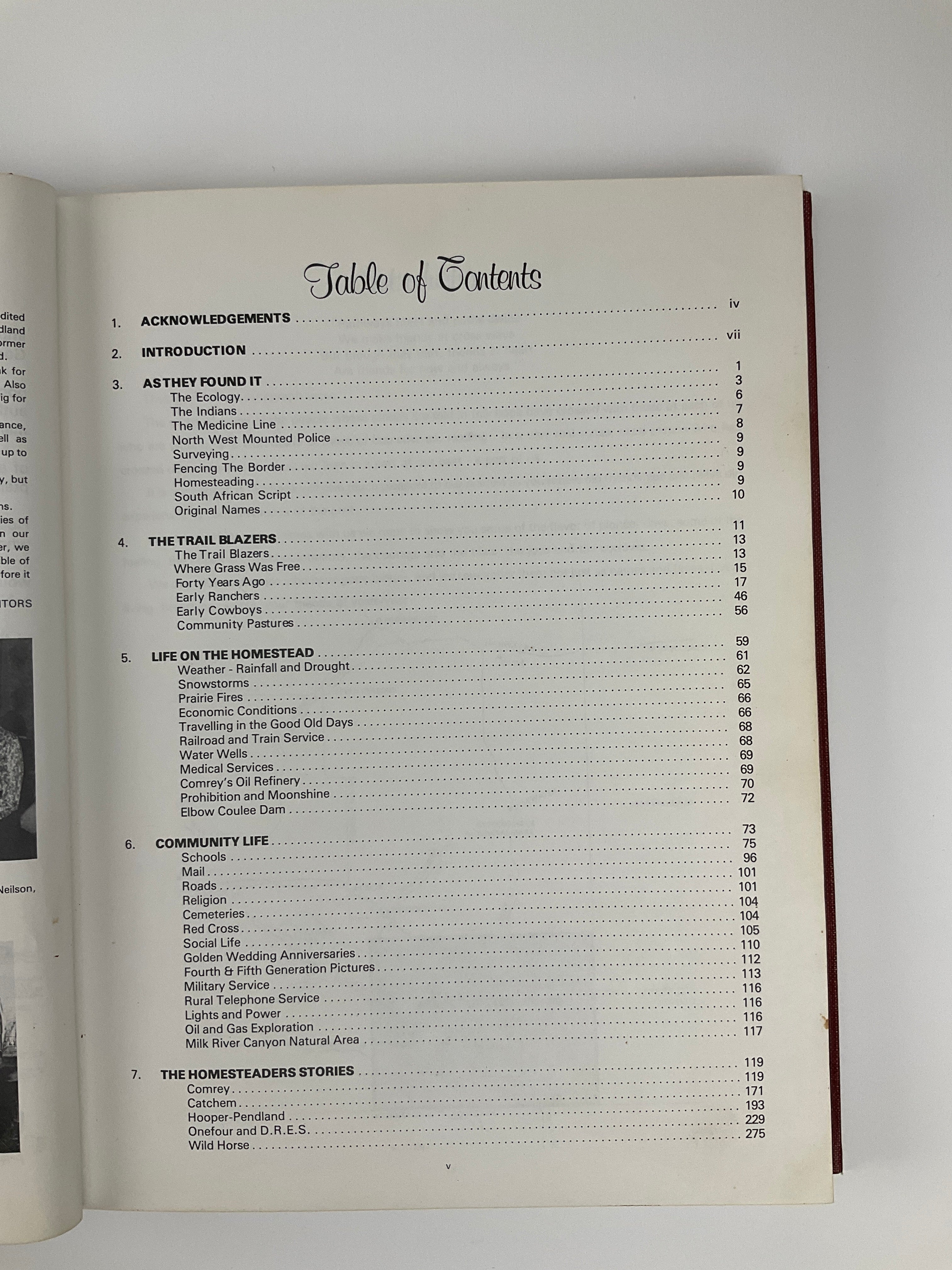 This volume contains a community history of several localities in south-east Alberta’s Cyprus County: Comrey, Catchem, Hooper-Pendland, Onefour, and Wild Horse. The book begins with a historical overview of the area’s early First Nations inhabitants, along with reminiscences and stories of homesteading life and agriculture. Topical chapters on local schools, churches, organizations, services, and industries follow. The book’s largest section contains family histories (esp. of early homesteaders) contributed by area residents, organized by locality. Includes index. No publication date indicated, but illustrations in the book are dated 1981, making a publication date of 1981 or later likely.