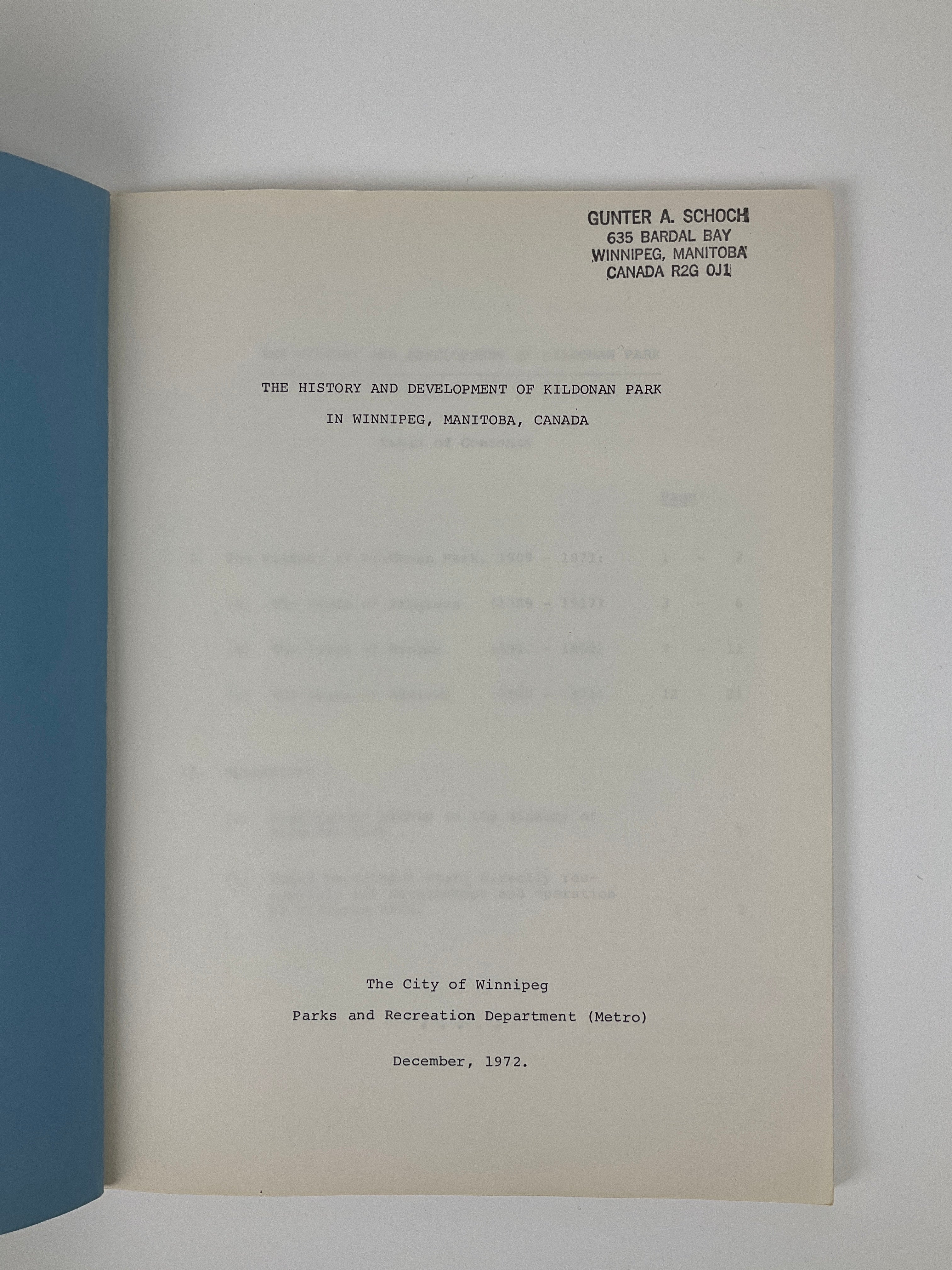 This volume traces the history of Kildonan Park in north Winnipeg from the land's purchase in 1909 until Winnipeg's unicity amalgamation in 1972. This history is divided chronologically into three chapters, each discussing new constructions, renovations, and important events. The impact of Red River flooding appears at several points. As a city publication, the volume's authors show particular concern for local politics, civic governance, and the effect of economic and social changes in Winnipeg on the park. Includes two 28 x 43 cm. (11 x 17 in.) fold-out maps of the Park from 1911 and 1969. This copy bears the stamp of Gunter A. Schoch, Landscape Architect for Winnipeg's Parks and Recreation Department at the time of publication (later, Director of Planning and Development). Schoch worked on projects throughout the city, including the Kildonan Park Pond development in 1964.