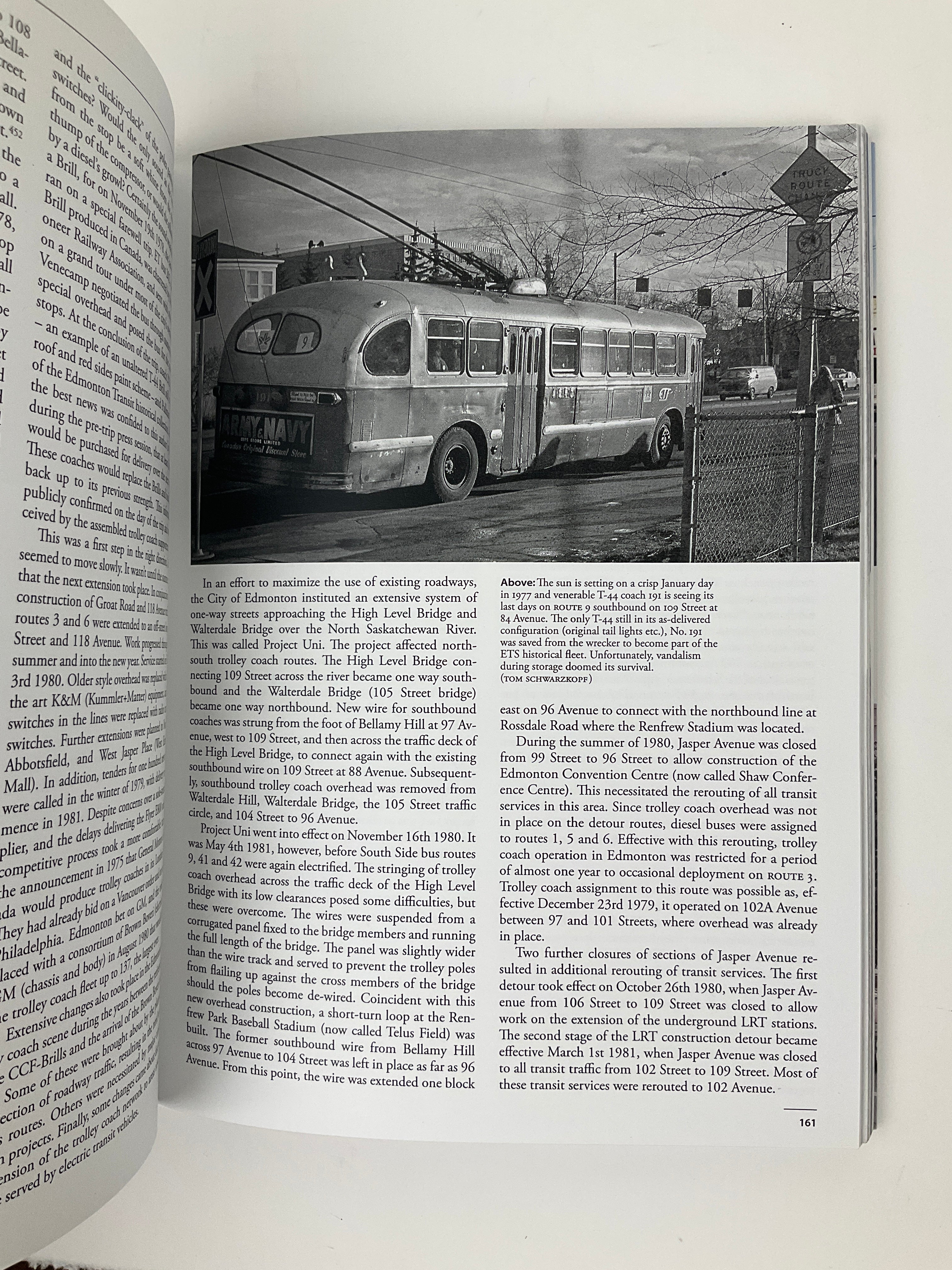 Each subsequent chapter focuses on one of the cities that operated trolley coaches—Halifax, Montreal, Ottawa, Cornwall, Toronto, Hamilton, Kitchener, Windsor, Port Arthur–Fort William, Winnipeg, Regina, Saskatoon, Calgary, Edmonton, and Vancouver. For each city, Schwarzkopf traces the origins of the trolley system, its operational history, technical aspects of its infrastructure, and the factors leading to its discontinuation (or continuation, in the case of Vancouver).