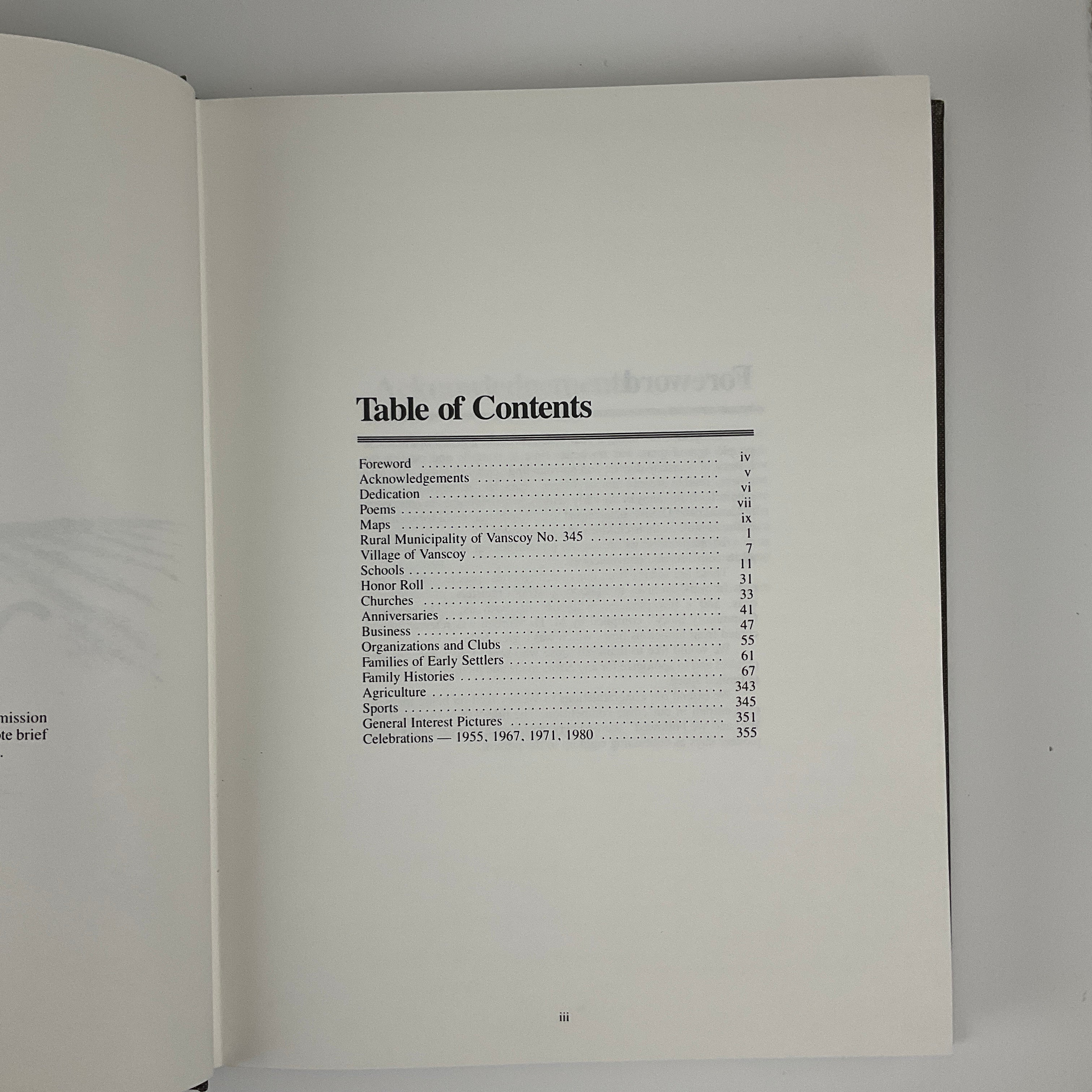 This volume contains a community history of the village and Rural Municipality (#345) of Vanscoy, Saskatchewan. Much of the volume consists of family histories contributed by area residents. A historical overview of the village and municipality, Honour Roll, and topical chapters on area agriculture, businesses, churches, organizations/clubs, schools, and sports teams precede the family histories. Short summaries of Vanscoy celebrations and events, as well as a brief photo collection depicting community life, appear at the end.