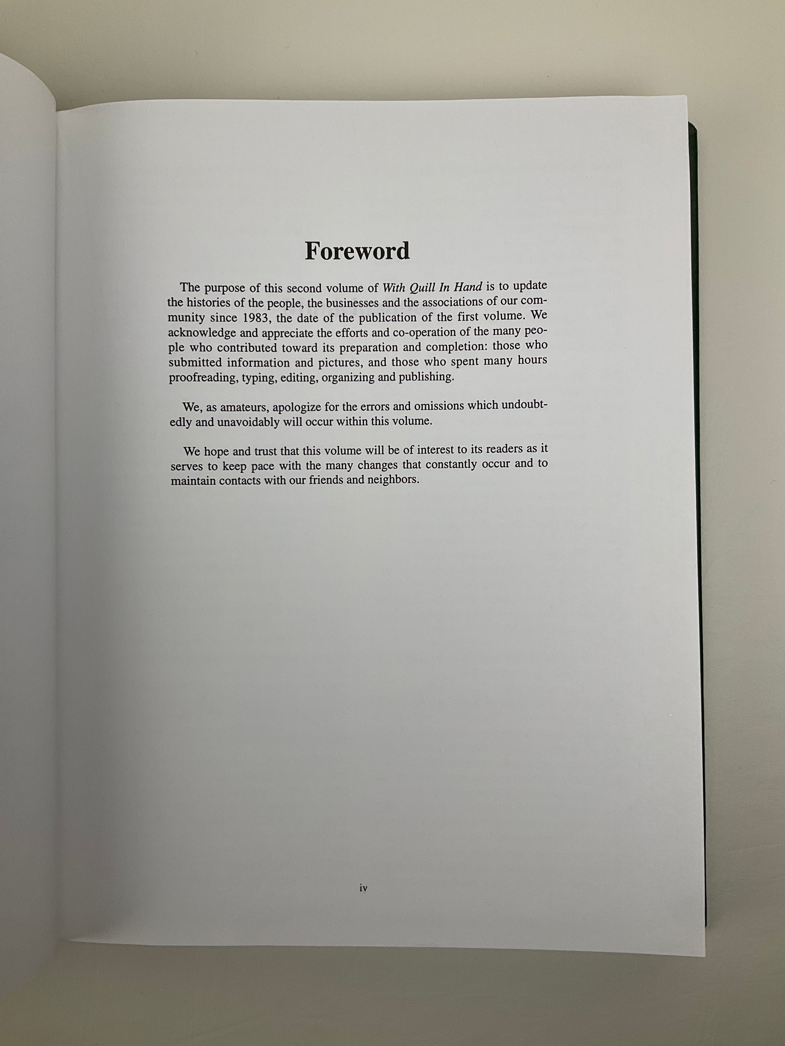 Two Volume Set: A community history of the village of Quill Lake and its surrounding rural district, this volume documents local development from 1903 to 1983. The book includes short essays on the nearby settlements of Wimmer, Clair, and Scrip, as well as the Gardenia Post Office, and provides individual accounts of numerous school districts, including Bradburn, Crocus Vale, Gardenia, Hacienda, Hunters Hill, Islay, Kingscourt, Clair, MacMahon, Park Villa, Quill Lake, Quill Lake View, Scrip, Selkirk, Sigstad, Twin Creek, Valley Plain, Westasta, Wimmer, and Wooler. Additional chapters address local churches, businesses, clubs and organizations, an honour roll, farming, and land ownership. The majority of the volume is devoted to family histories contributed by area residents.